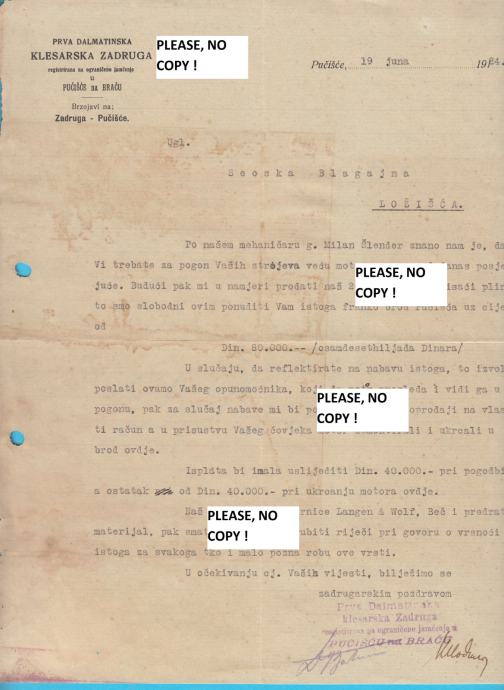 PRVA DALMATINSKA KLESARSKA ZADRUGA - PUČIŠĆA (BRAČ) dopis iz 1924.god.