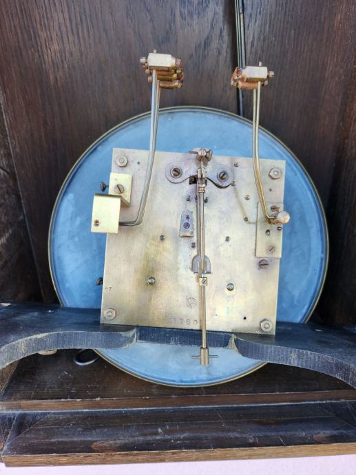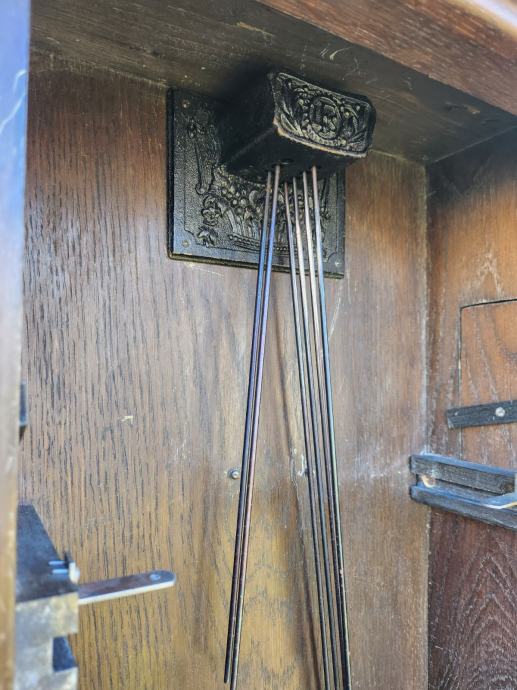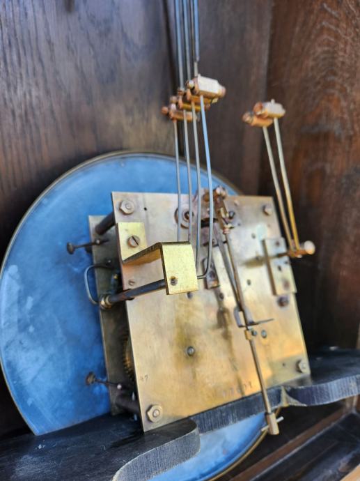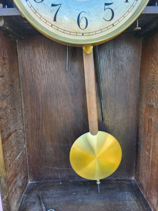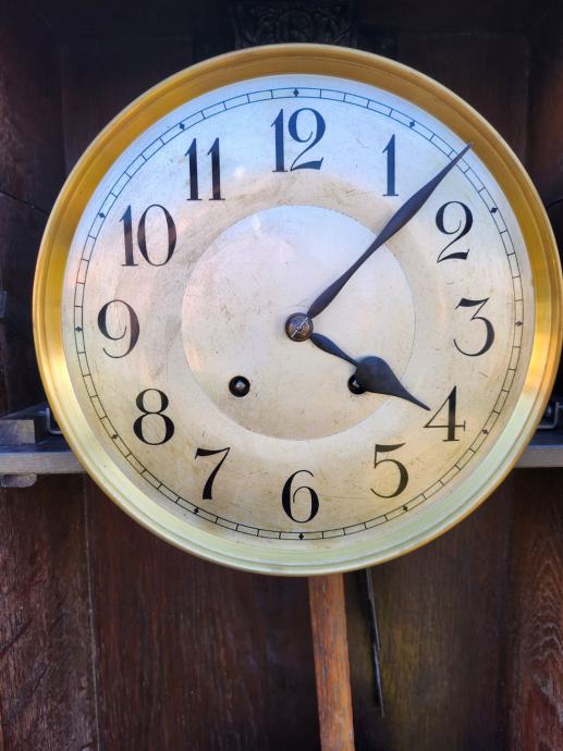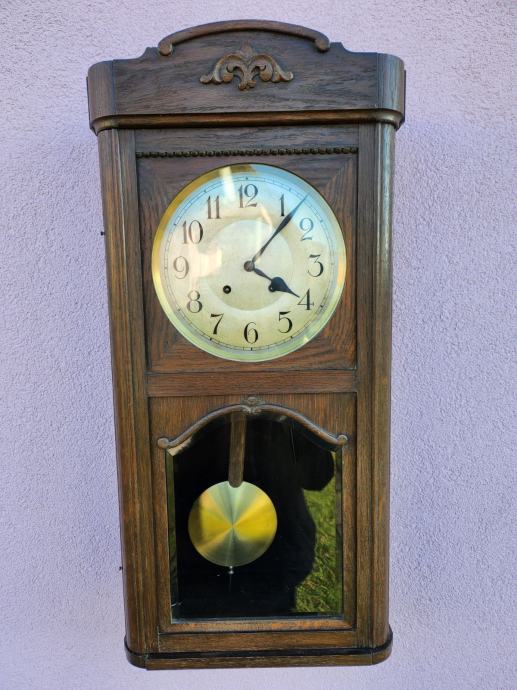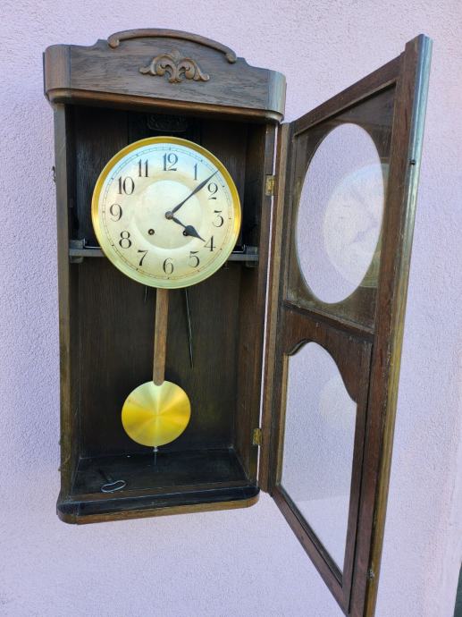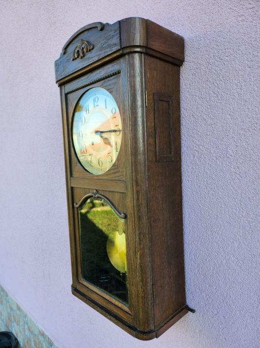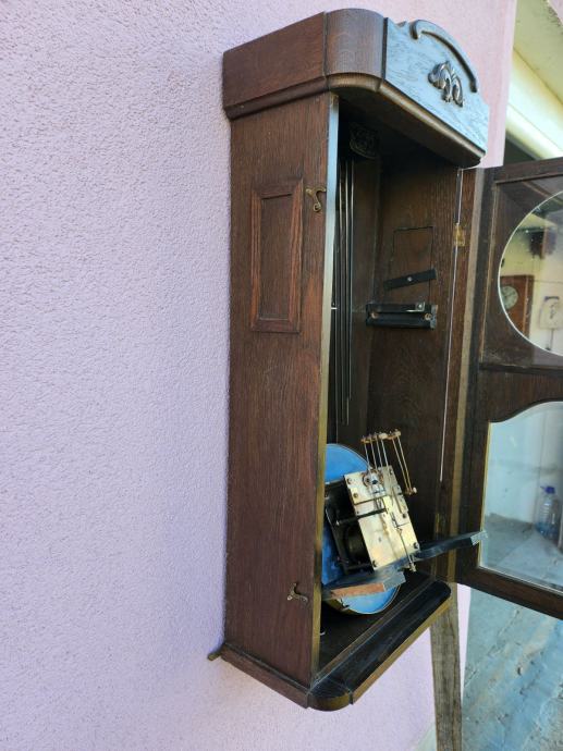 Rijetkost: Poseban zidni sat sa dva navijanja! Sat zvoni svakih 15 minuta i na puni sat koliko je sati. Sat je ispravani i zvoni ugodnim tonom. Ima ključ za navijanje i sa jednim navijanjem radi i zvoni osam (!) dana. Dimenzije sata: Visina 74 cm, širina 34 cm, dubina16 cm.