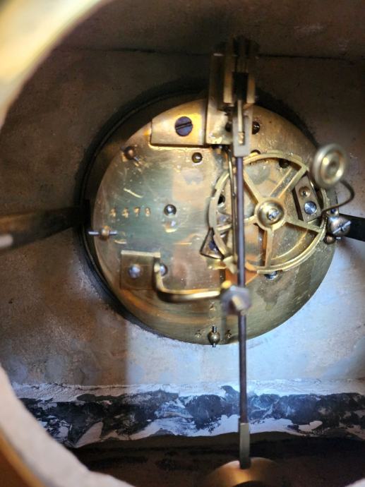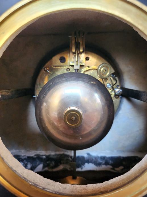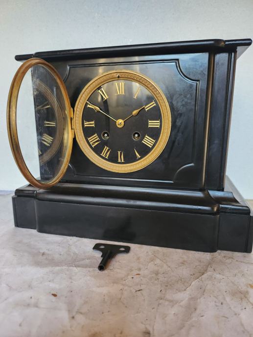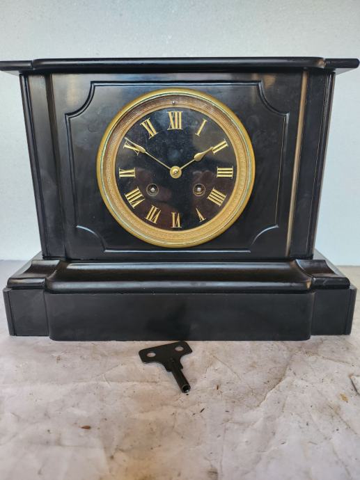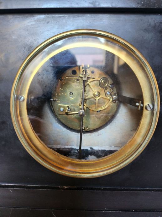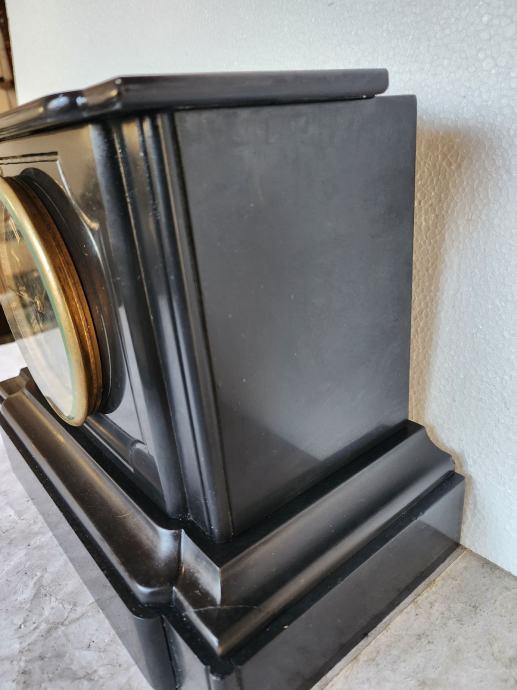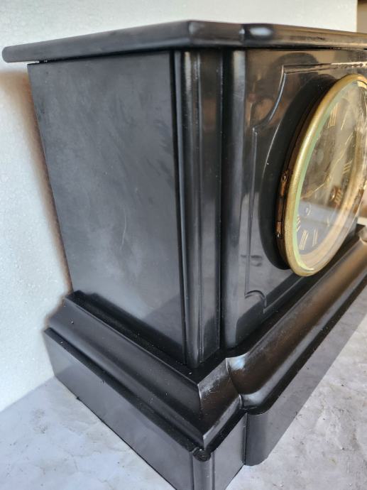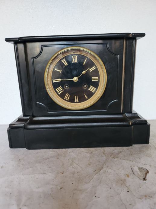Stolni ili komodni sat u mramornom kućištu. Sat je ispravan i zvoni svakih pola sata jednom i na puni sat koliko je sati. Ima ključ za navijanje . Sat je vrlo dobro očuvan (ima samo na jednom mjestu malo oštećenje - vidi sliku), sa posebno lijepom crnom pločom i brojevima kao pozlaćeni.