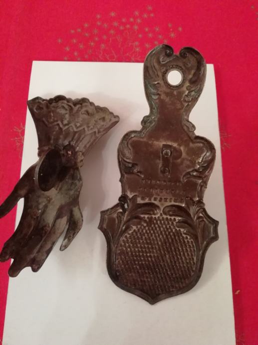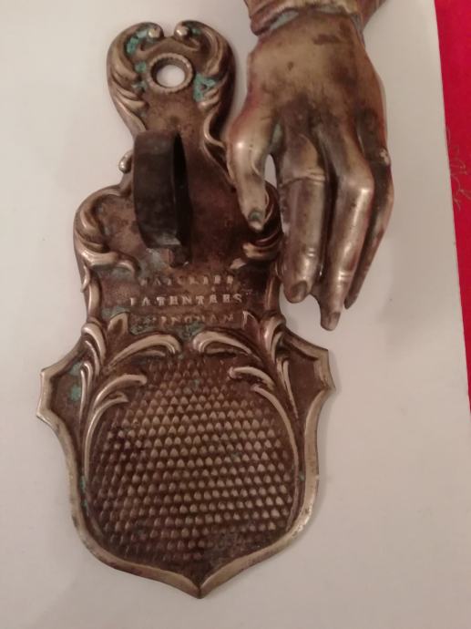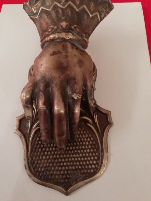 Komad je tijekom godina razvio prekrasnu patinu koja naglašava fine detalje. Ženska ruka ima duge, vitke prste, s prstenom na kažiprstu. Tu je i elegantna viktorijanska čipkasta manžeta zamršenog dizajna koja prekriva područje zapešća i ukrašena narukvica. Na vrhu se nalazi rupica, pa se može koristiti i kao zidni ukras.