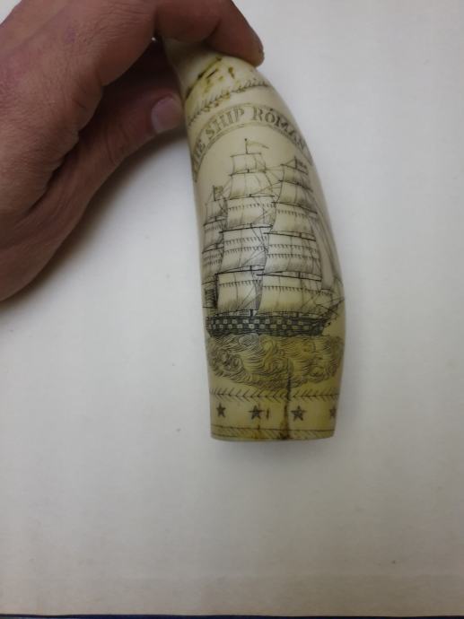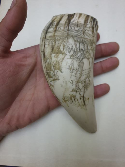 Dvije replike zuba kita ulješure kvalitetne izrade sa nanesenim znakovima starenja kao što bi bili na autentičnom zubu, očuvani, komadi su stariji od 30 godina. Ukrašeni su rezbarenenjem i pigmentiranjem rezova (scrimshaw). Slike na komadima su pomorskog okršaja i kitolovca klase "Roman". Izgledom, izradom i stilom pripadaju u 19.st. Odlicni pokloni i dizajnerski dodaci dezenu. Prodajem ih po komadu za 90€, a zajedno za 160€.