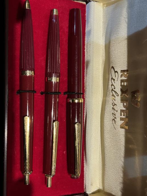 REXPEN Država/Proizvođač/Model Hrvatska, Rexpen ExclusiveGodina proizvodnje 1960-1970 Sustav punjenja FP Klipno punjenje, MP 1,2 mm olovni vrh F veličina, 14C 585 zlato Materijal/boja Plastika-Bordeaux, pozlaćeni metalni dijelovi Dužina (zatvoreno/s čepom ) FP 132 mm, MP 133 mm, M 129 mm Uvjeti/informacije za ovaj pertikularni predmet Ovo je vrlo jedinstven i izvrsno izrađen set od strane TOZ-Hrvatska, linija Rexpen. Ova tvrtka je bila partner njemačkoj tvrtki Refom, a mnoge proizvode (patente) tvrtke Reform proizvodio je i TOZ Croatia. Ovaj Rexpen Exclusive sastoji se od nalivpera, klipnog punila, mehaničke olovke i vrlo rijetkog markera, čije se punjenje može mijenjati. Olovke dolaze u vrlo lijepo izrađenoj kutiji od crvene kože visoke kvalitete.
