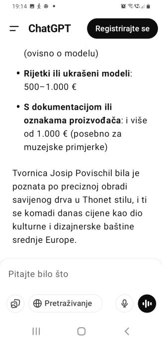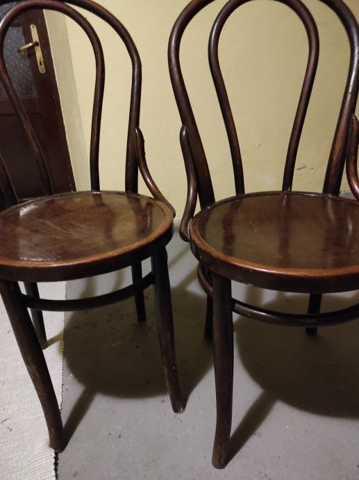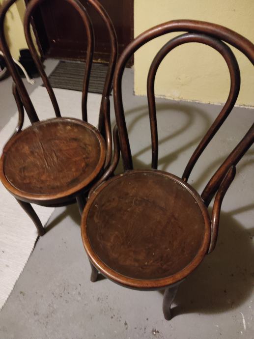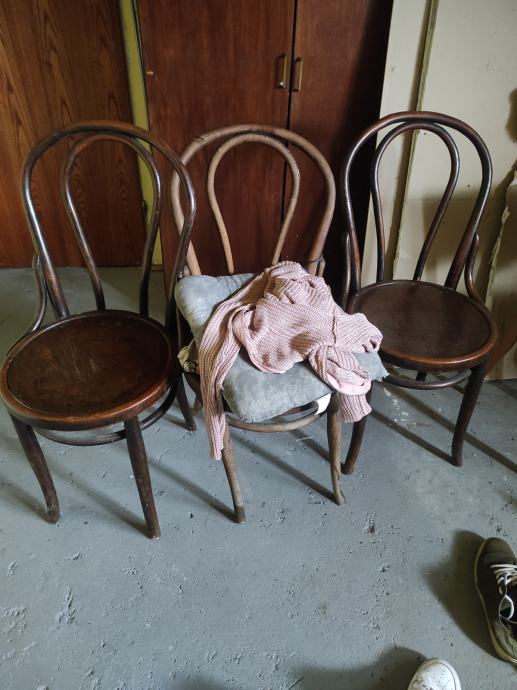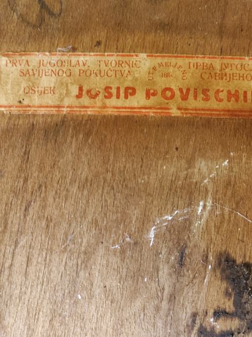 Tri mozda muzejski primjerci stolica izrađene u Osijeku u tvornici JOSIP POVISCHIL ,prvoj tvornici u Jugoslaviji koja je izradila savijeno pokućstvo.Tvornica Josipa POVISCHILA je radila stolice u Thonet stilu ,sa savijenim djelovima te sa oslikanim sjedištima na stolicama i većinom okrugli oblik.Moje dvije stolice su u dobrom stanju osim sto su blago izlizana sjedišta sto je normalno za tu starost stolica,a jedna sto sam nasao naknadno je u stanju za restauraciju( sliku nove stolice ubacujem u slike.Stolice imaju logo od navedenog POVISCHILA i u slikama cu staviti natpis sto sam skinuo sa interneta,a radi se o tome da su ove stolice nekada bile u aukcijskoj kuci te su nekome prodane, vrijede jako puno ali u svijetu,u Hrvatskoj niti blizu realne cijene,ovisno o godini proizvodnje.Moja cjena je za svaku 40 eura tako da si kupac moze restaurirati i ako zeli zaraditi ili ostaviti sebi prvu klasu stolica ,ako netko kupi sve tri i cijena Ce se korigirati u dogovoru sa kupcem.Za sve informacije Nazovite na broj 097-6601365 ili pošaljite upit na Viber ili Njuskalo. Preuzimanje stolica osobno ili slanje poštom ili autobusom ili kako kupac želi.Vidi slike!!