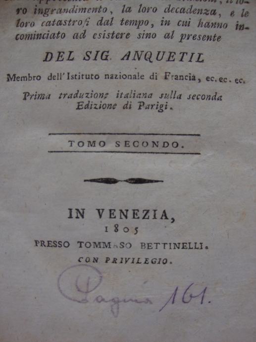Stara talijanska knjiga iz 1805. godine napisao ANQUETIL tiskana u Veneciji Tomasso Bettinelli