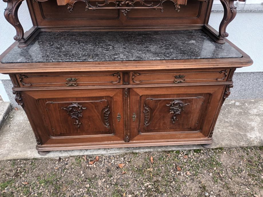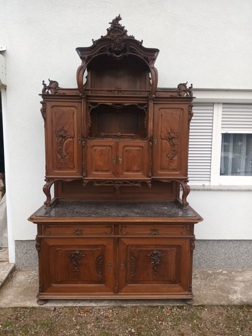 Ovaj komad namještaja je masivni antikni Alt Deutsch kredenac ili vitrina za posluživanje, prepoznatljiv po bogatim rezbarijama i mramornoj ploči. Stilski se opisuje kao mješavina neorokokoa (Louis XV) i ranog Art Nouveau stila, karakterističnog za razdoblje kasnog 19. ili početka 20. stoljeća (oko 1890. – 1900-ih).