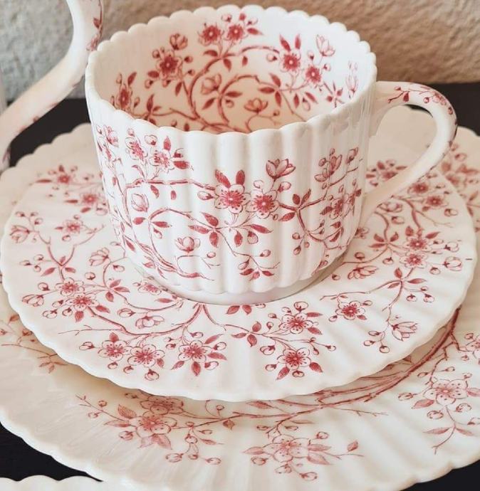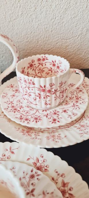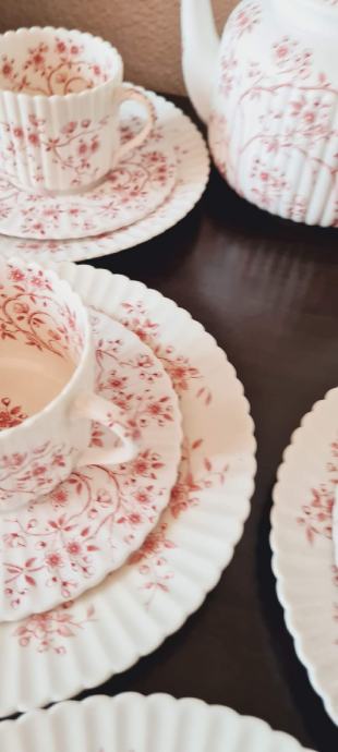 Prekrasan koštani porculan. Desertni tanjuri su malo požutjeli, pa idu gratis uz šalicu.