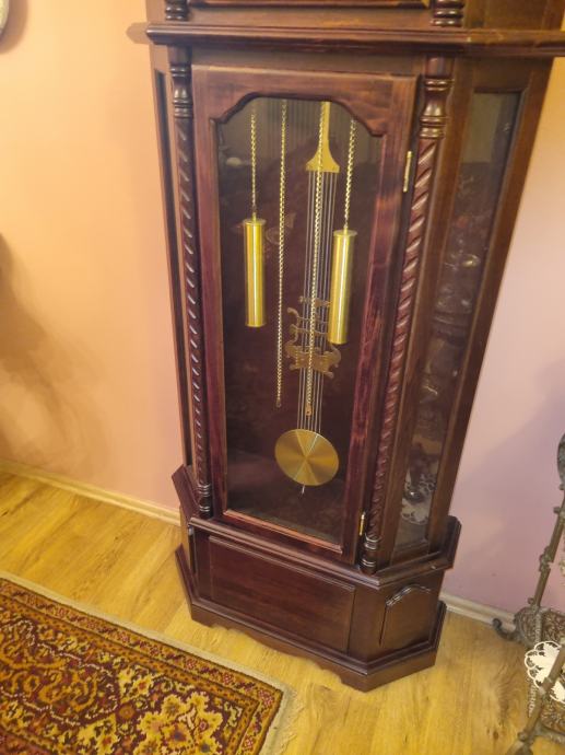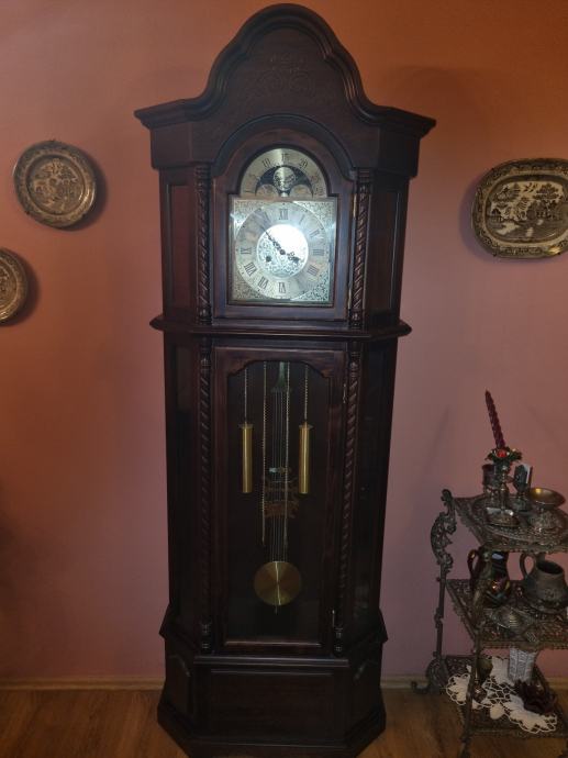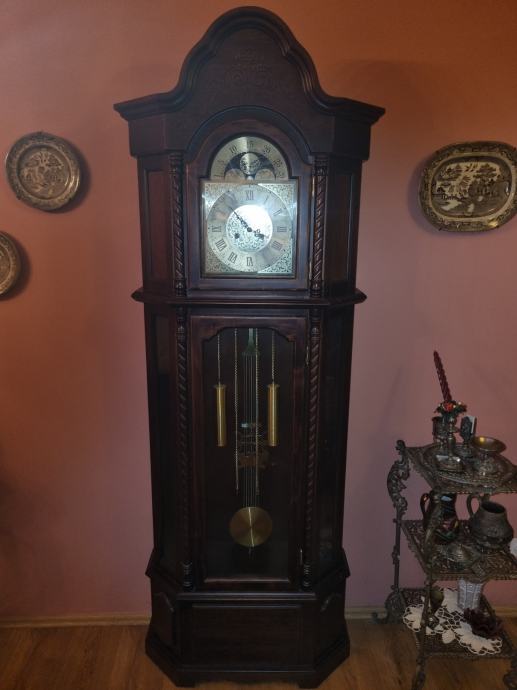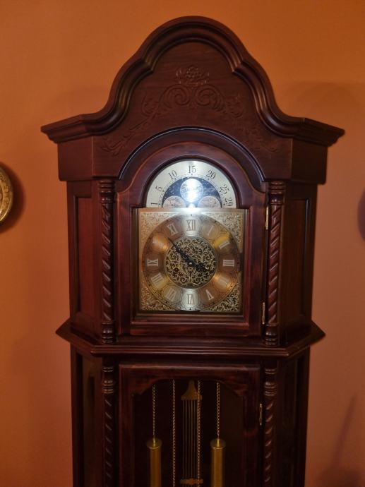 Masivan samostojeći sat u drvenom kućištu, klasičnog dizajna.