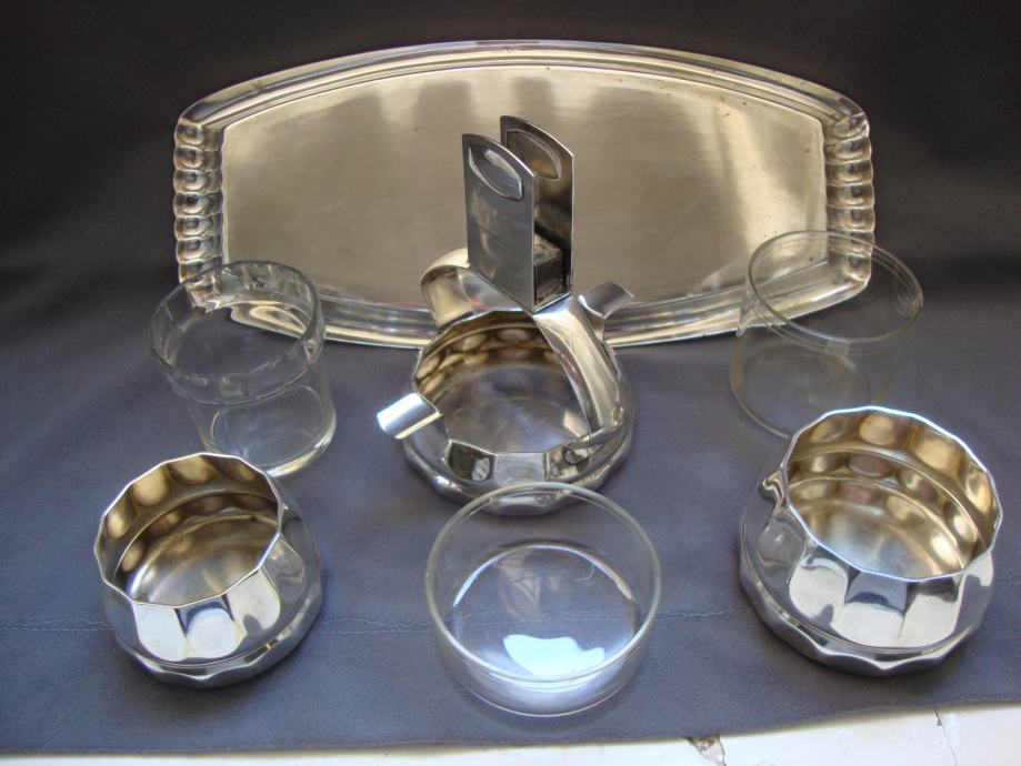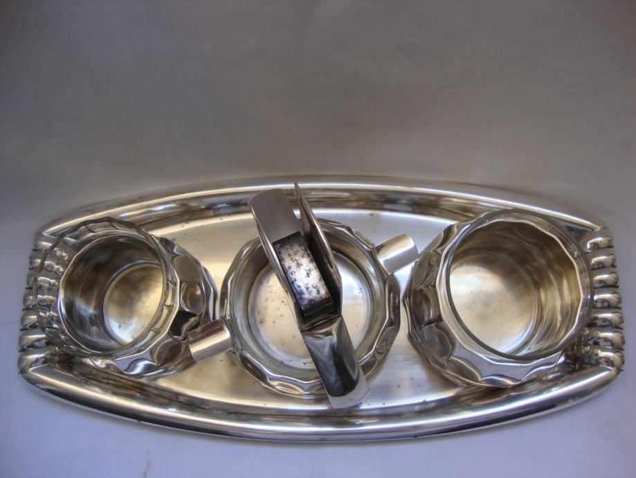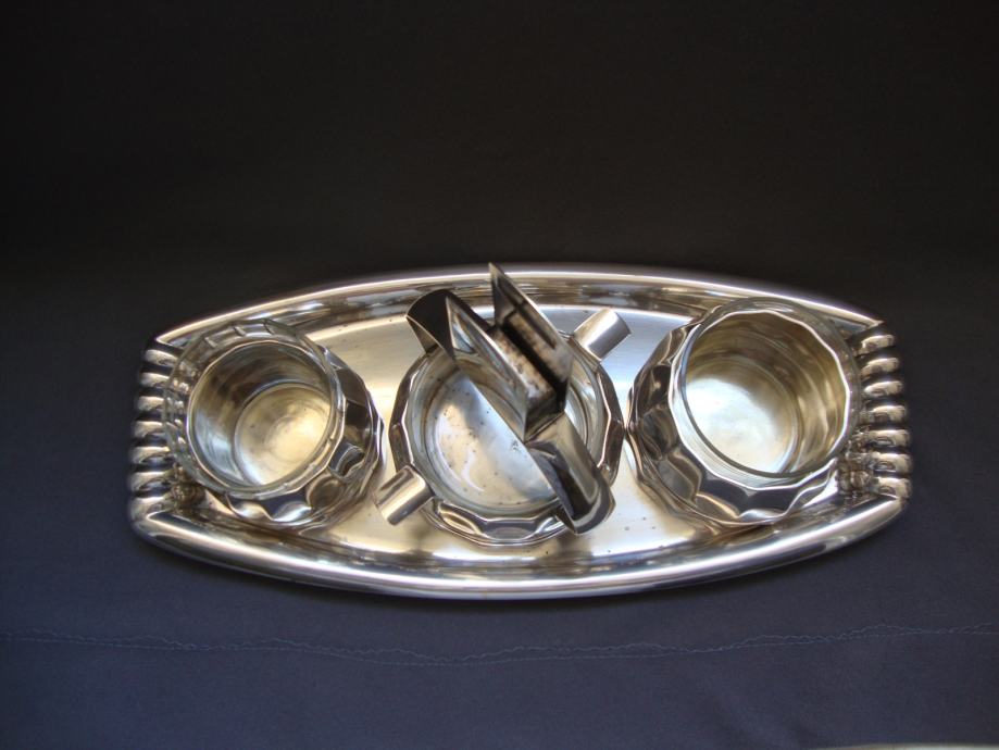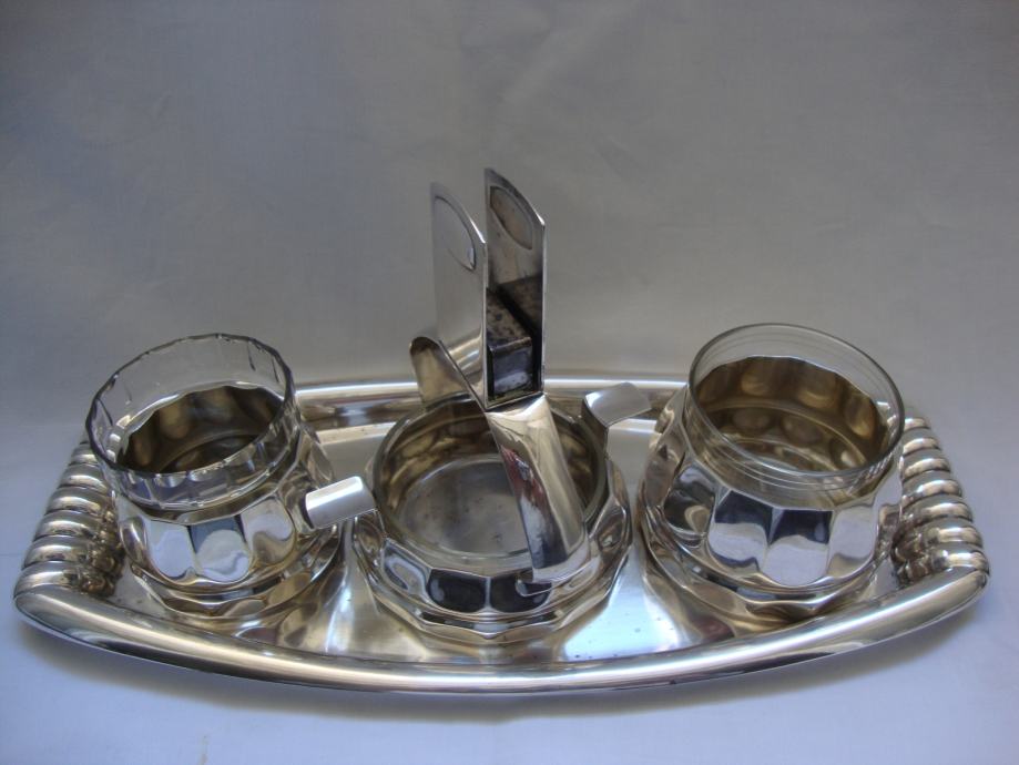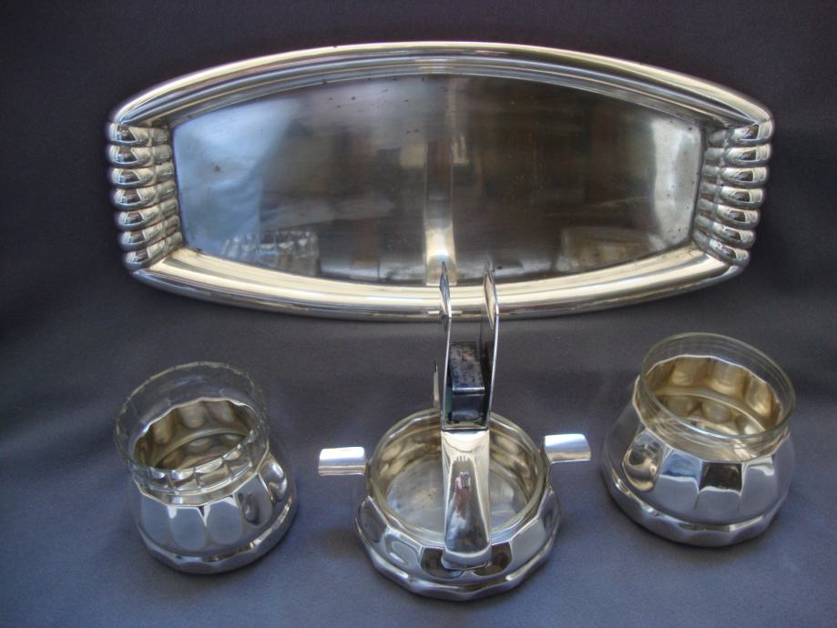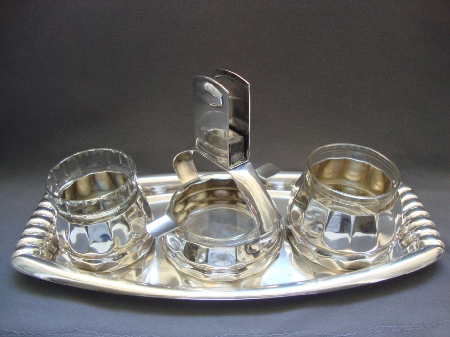 Predivni stari set komplet 4 komada poznate firme SANDRIK- (ČEHOSLOVAČKA ,AUSTRO-UGARSKA ) 1930. -1940.godina proizvodnje u vremenu art dekoa posrebrni set kompletan sa kristralnim umecima