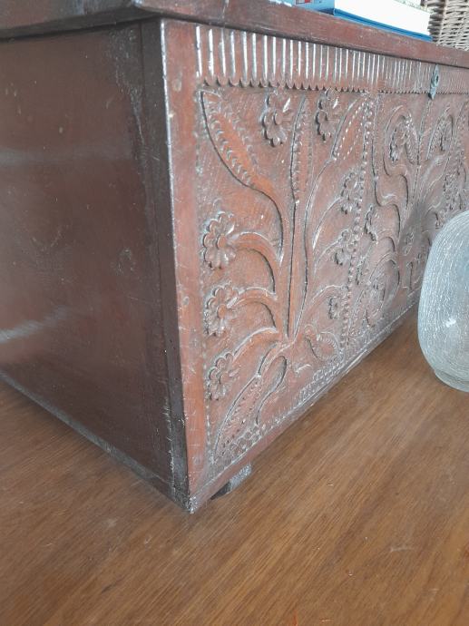 U Istri se kaže bavulj. Pronađen u staroj istarskoj kući i bile su struhle sve stranice osim ove prednje rezbarene.Sve stranice skupa sa poklopcem su promijenjene i sve skupa komplet ofarbano sa bojom za drvo.Ova prednja rezbarena je valjda bila od nekog drugog kvalitetnijeg drva i dali u pravom vremenu otpiljena kad je još bila deblo. Vrlo staro , cijena nije fiksna , moguća zamjena za razno ,moguća dostava za istarsku i primorsko goransku županiju.
