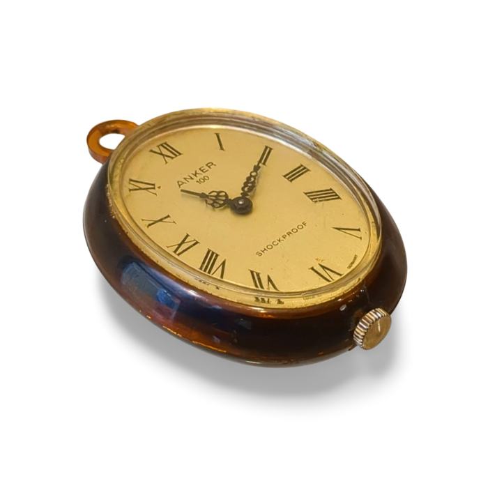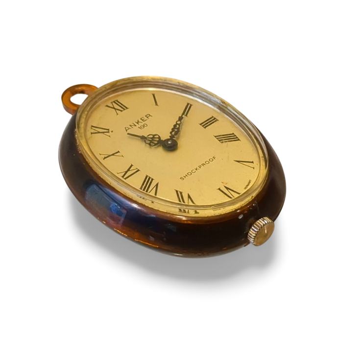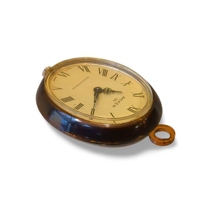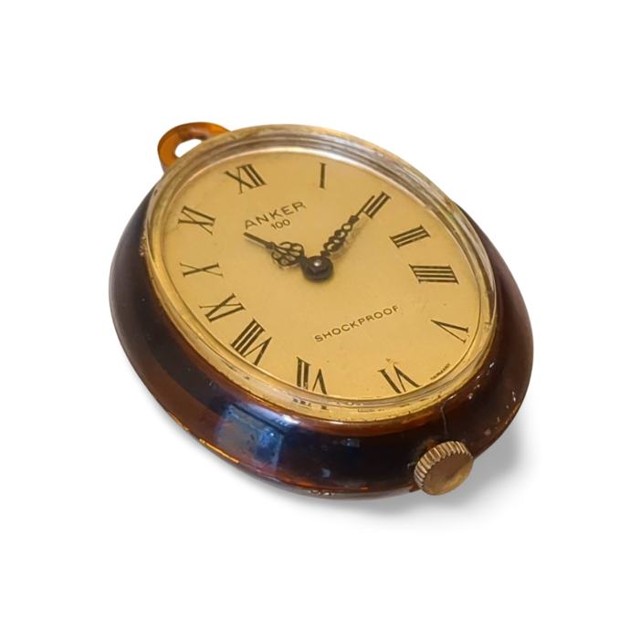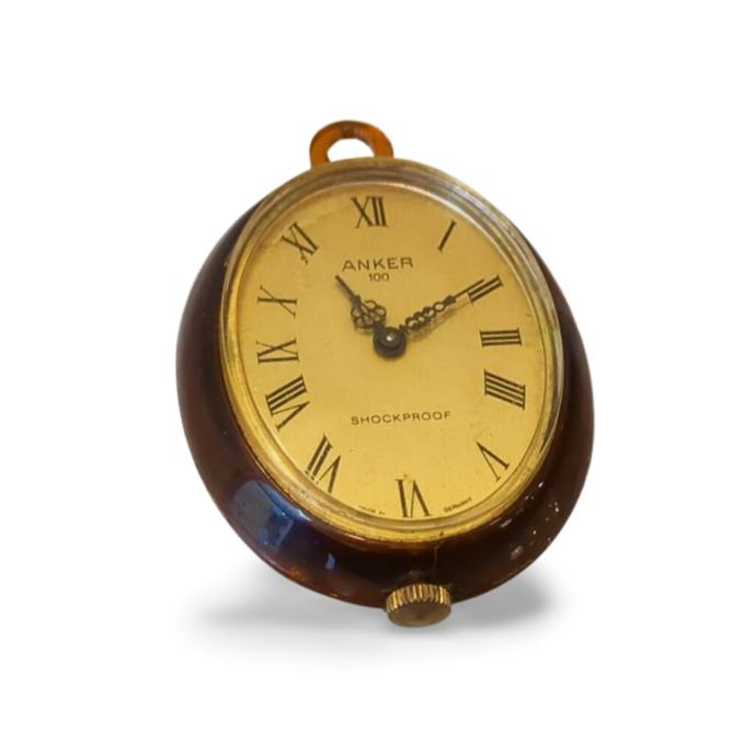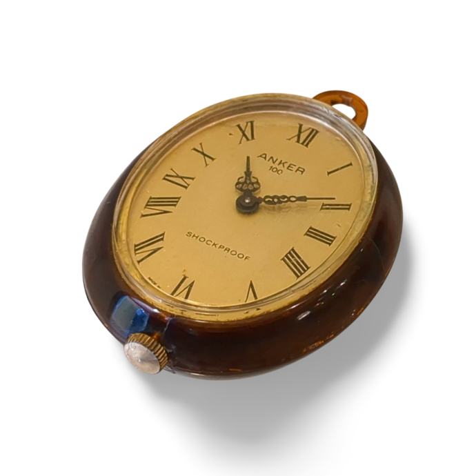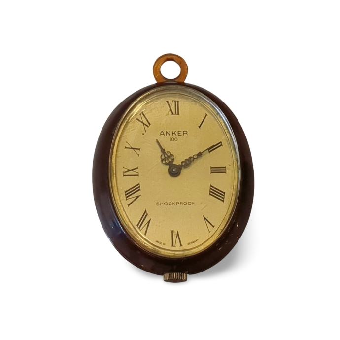 Njemački sat Anker 100 iz 1960ih u ovalnom kučištu od smeđeg bakelita. Sat radi uredno i točno, pokreće se ručnim navijanjem mehanizma.