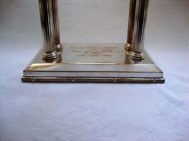 Ukrasno kućište stoji na kolonama koje su prićvščene za ukrasno postolje koje ima na sebi posvetu: