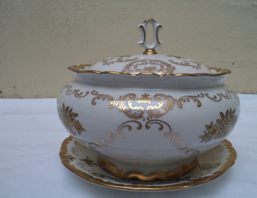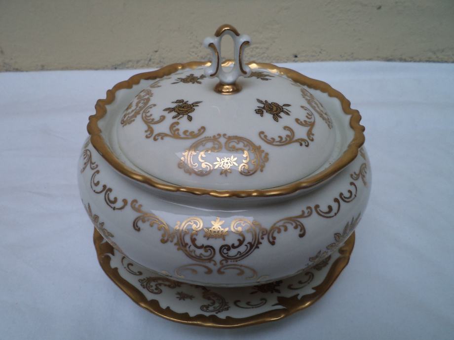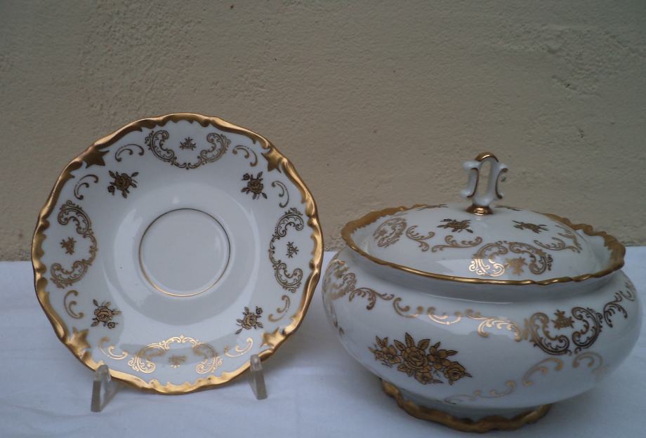 Predivna velika kompletna doza ,bomboniere,šečernica sa tanjuričem bogato izradenim zlatnim detaljima u odličnom stanju stari njemački porculan