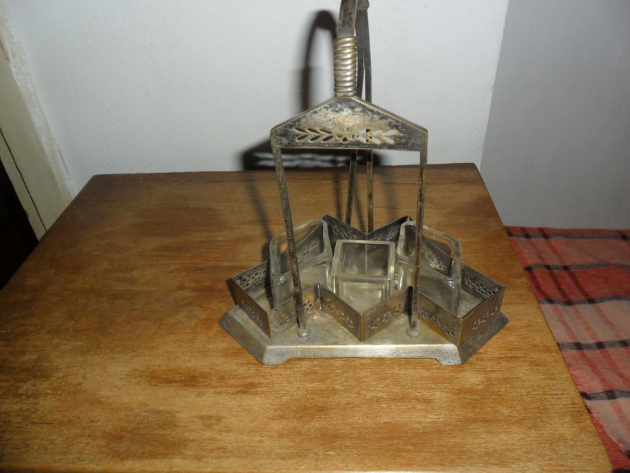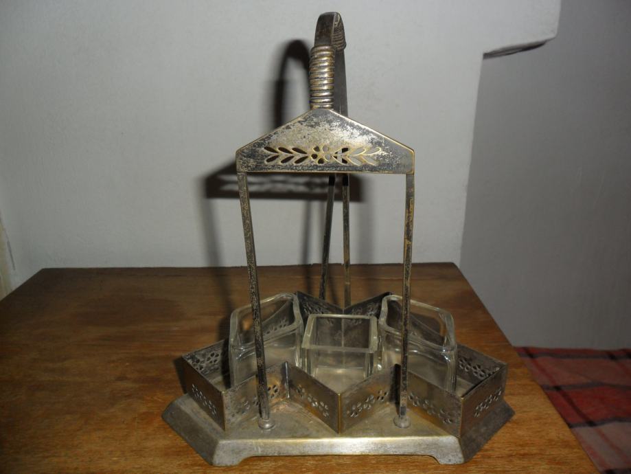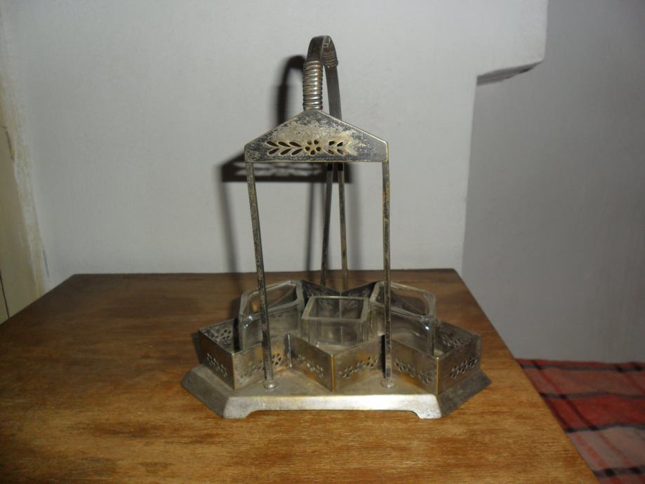 Prodajem posrebreni mesing secesijsku posudu sa staklenim umecima za razne začine (sol,papar,etc)