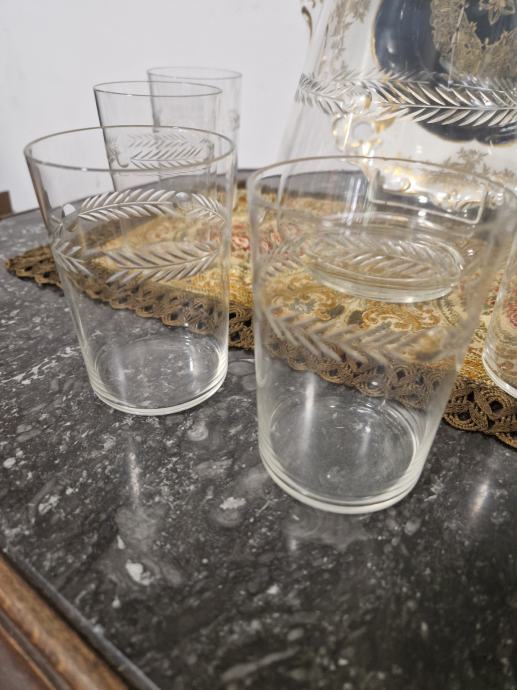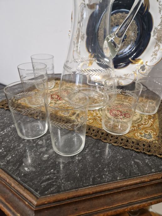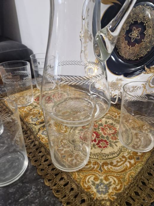 Bokal je visine 25 cm a čaše su visine 9 cm a promjer otvora 6.5 cm.