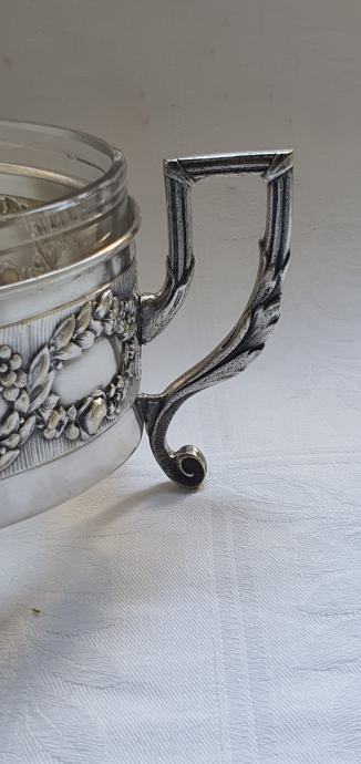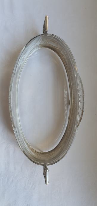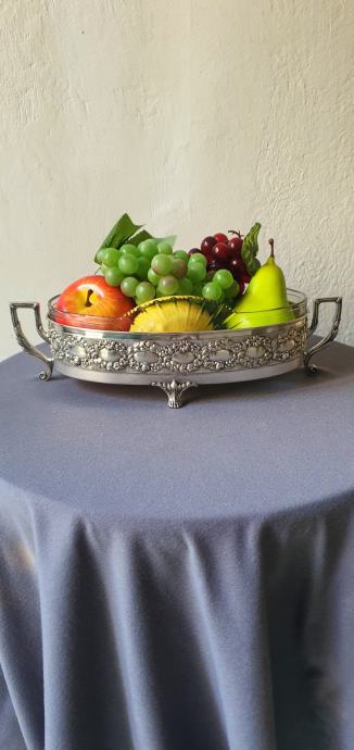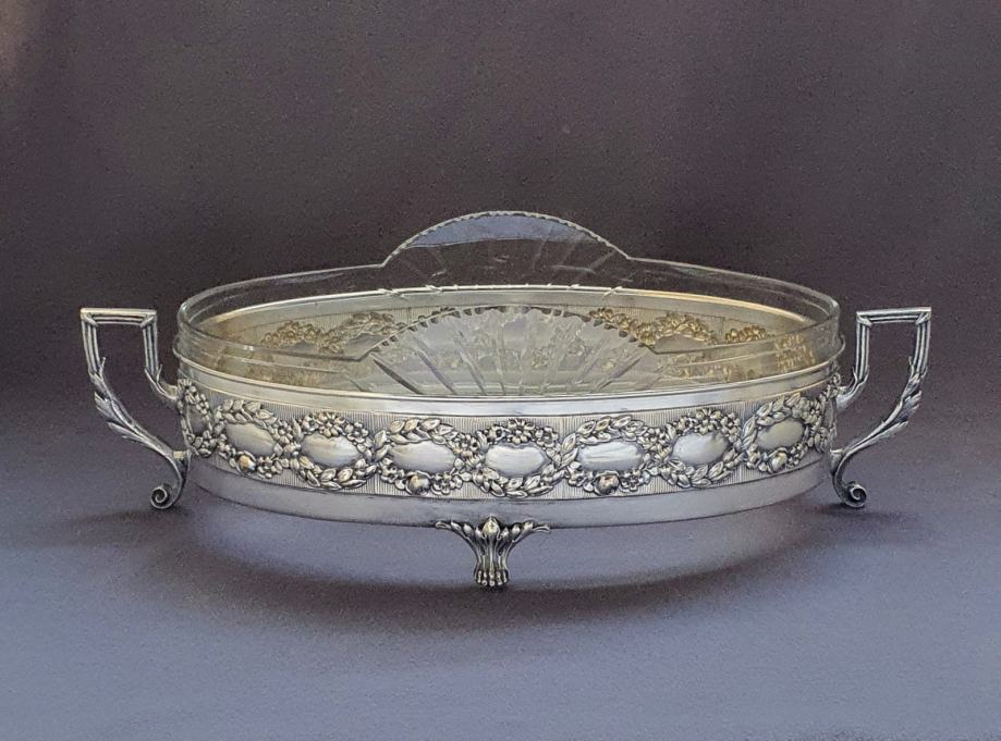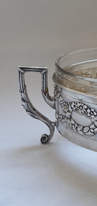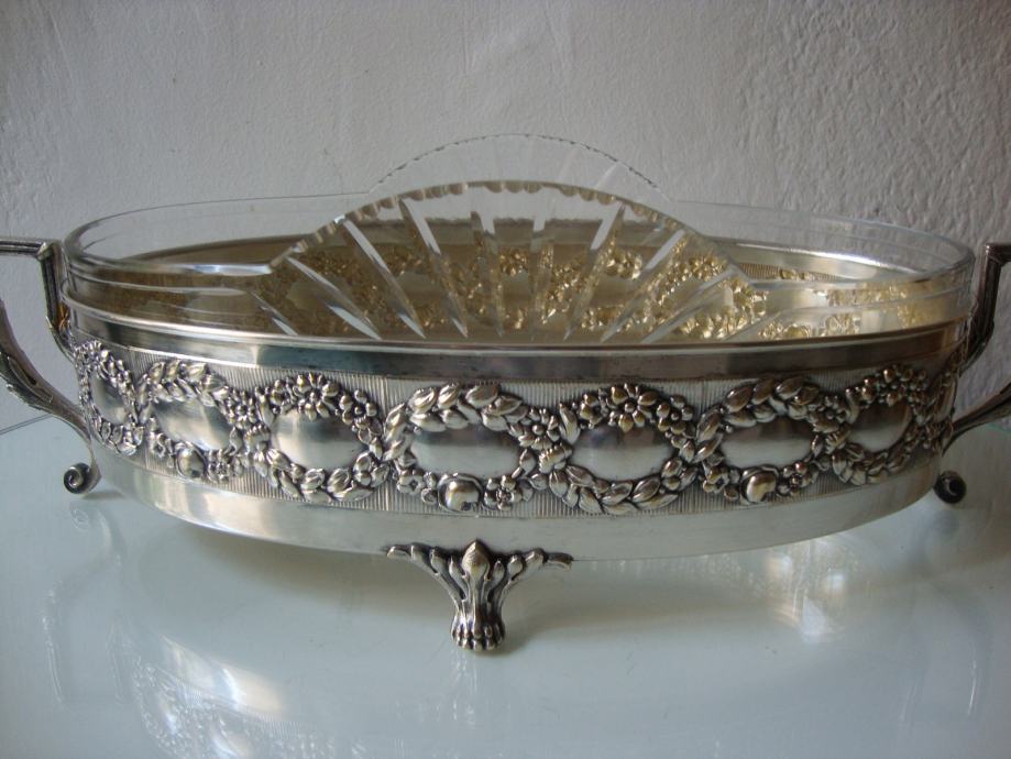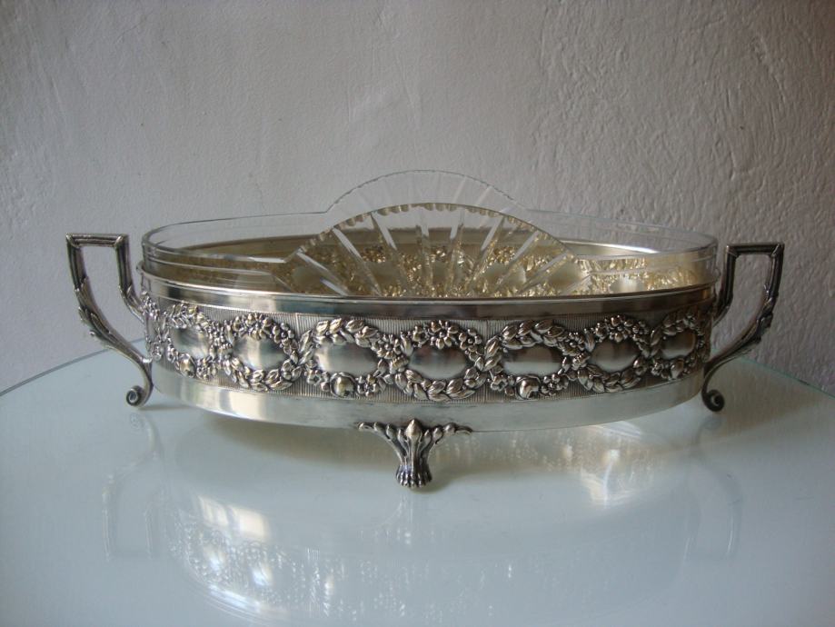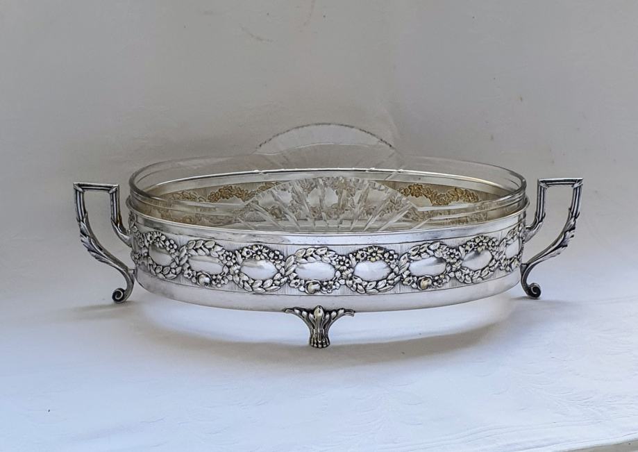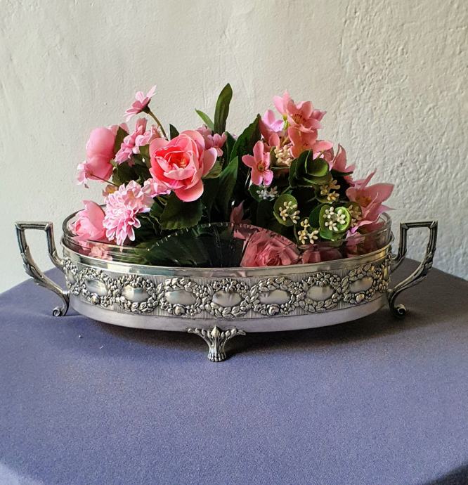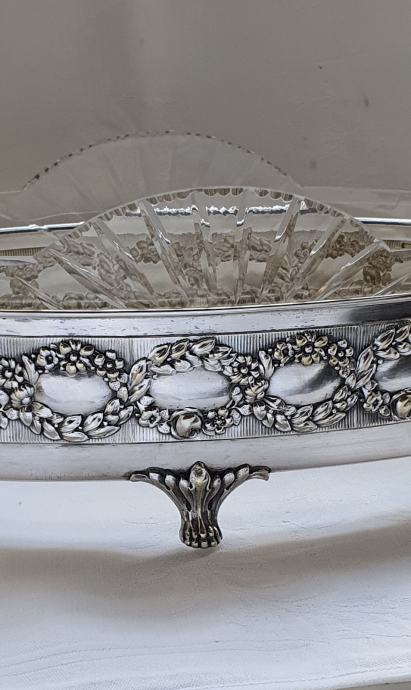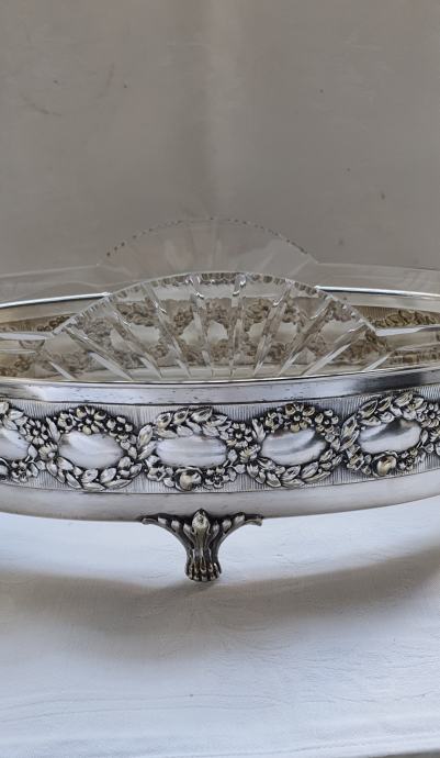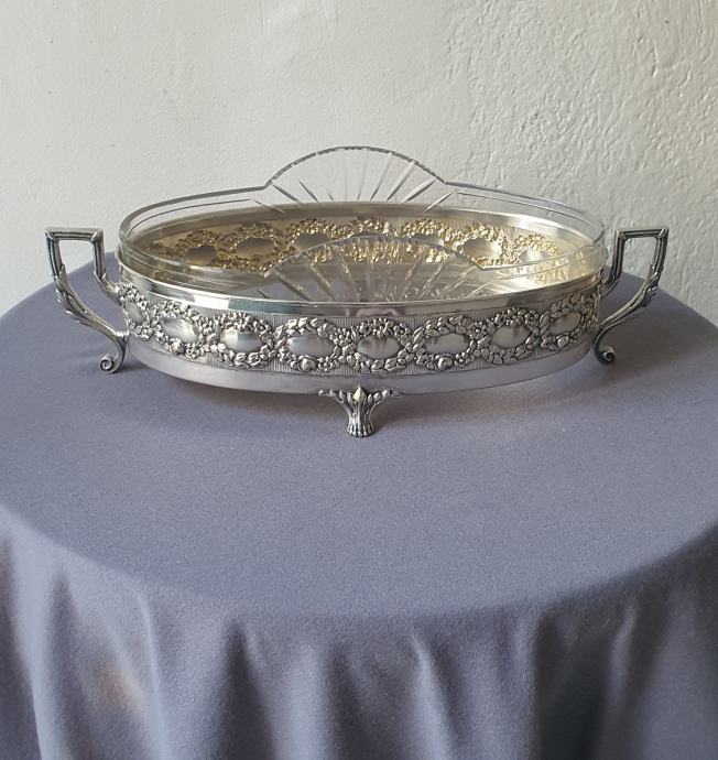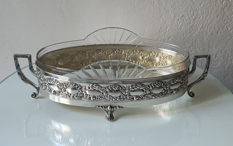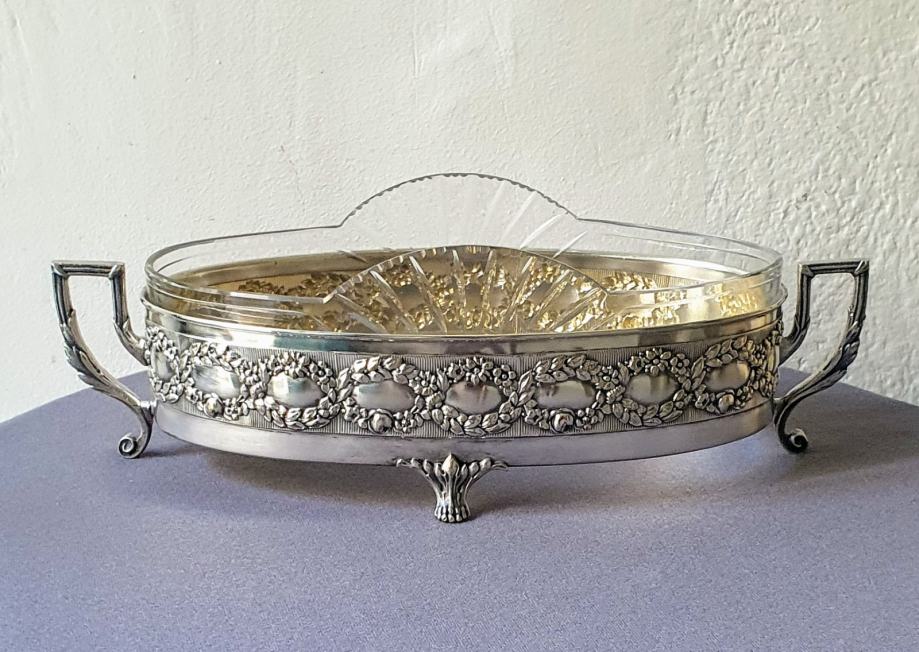 Secesijska zardinjera sa originalnim kristalnim brusenim staklom u perfektnom stanju bez oštečenja posrebrenje,rubno ukrasena reljefnim floralnim motivom na 4 nozice i stilske rucice