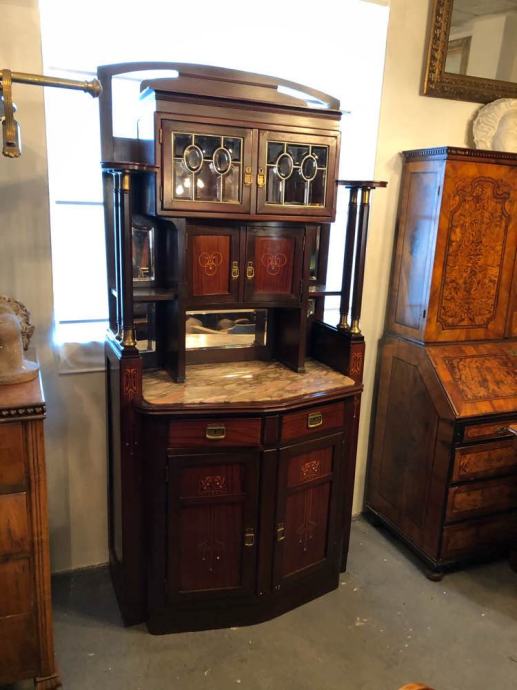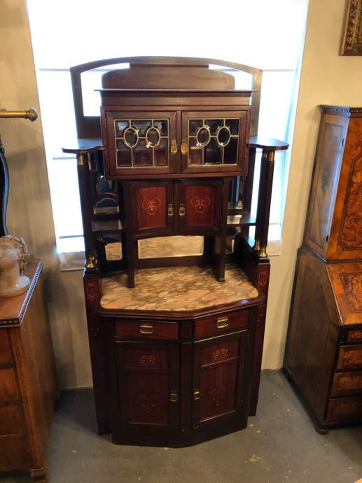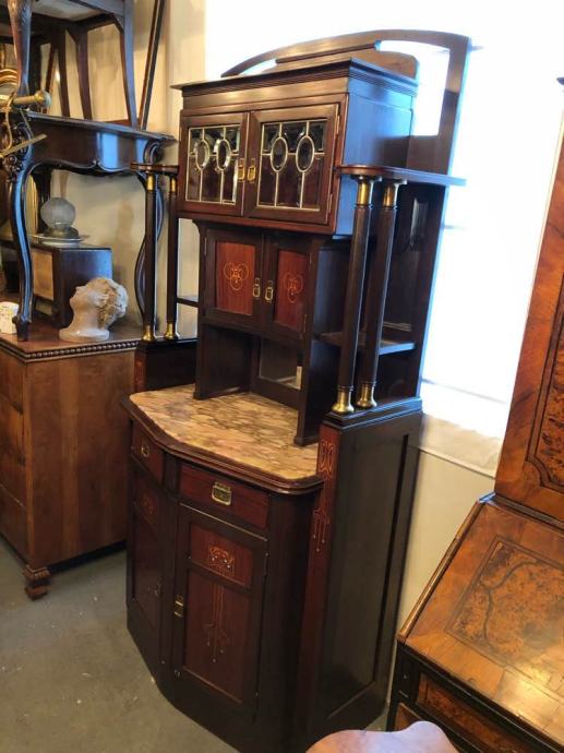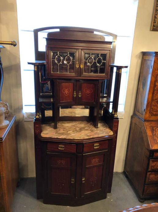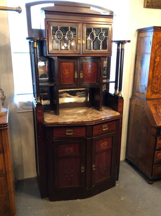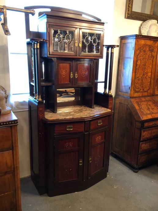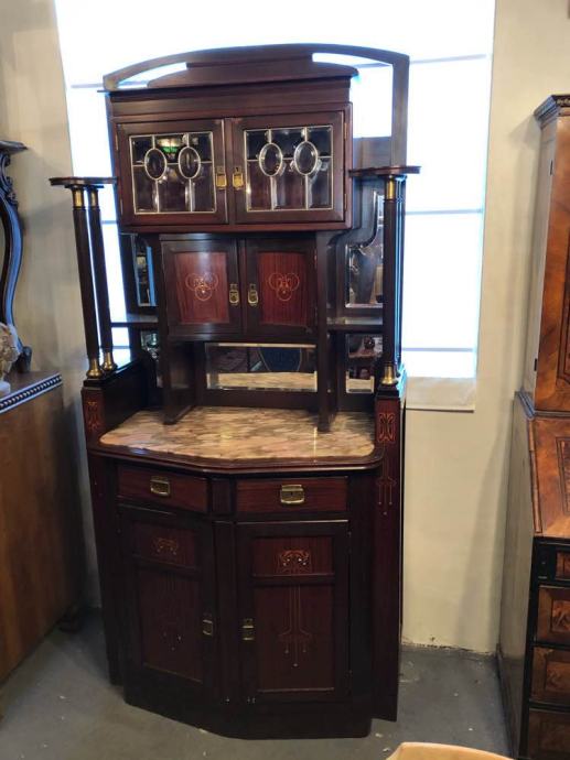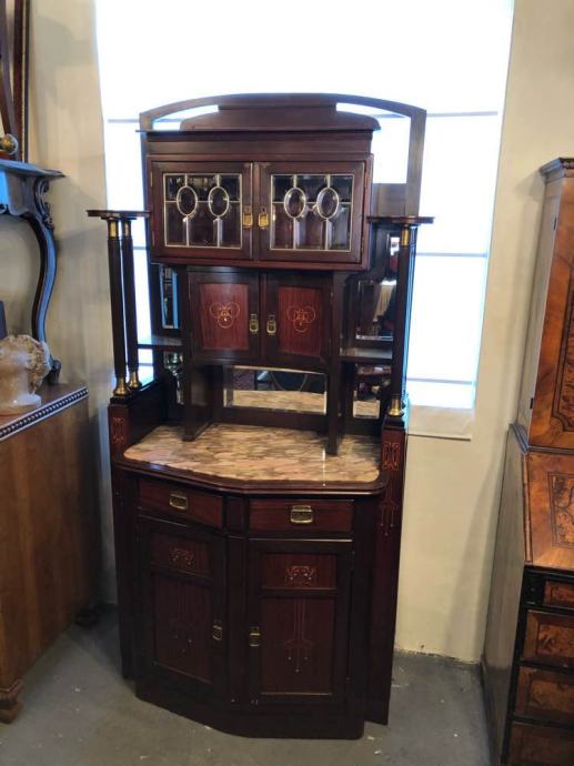 Mali kredenac iz doba secesije u vrlo dobrom stanju prekrasnog dizajna i jos ljepsih intarzija od sedefa i javorovog drva sa brusenim stakloma i mesinganim ukrasima.
