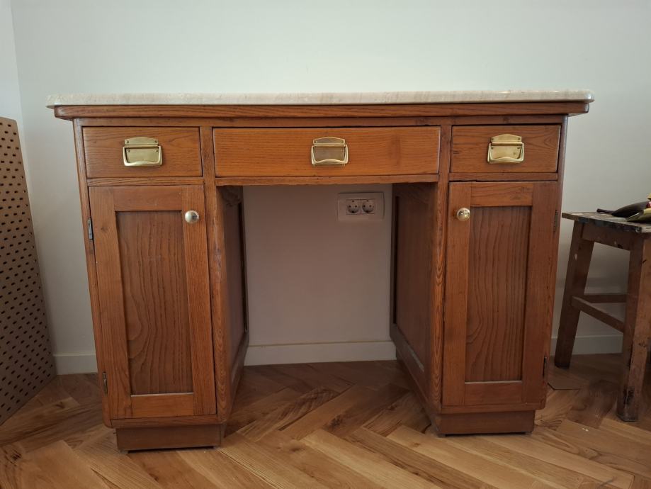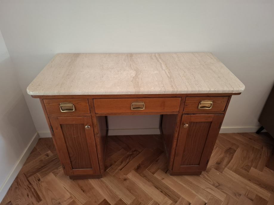 Secesijski radni stol u izvrsnom stanju očuvanosti. Visok 75 cm, a širok 107 cm. Mramorna ploča nije zaljepljena.