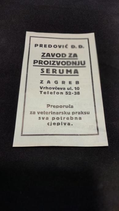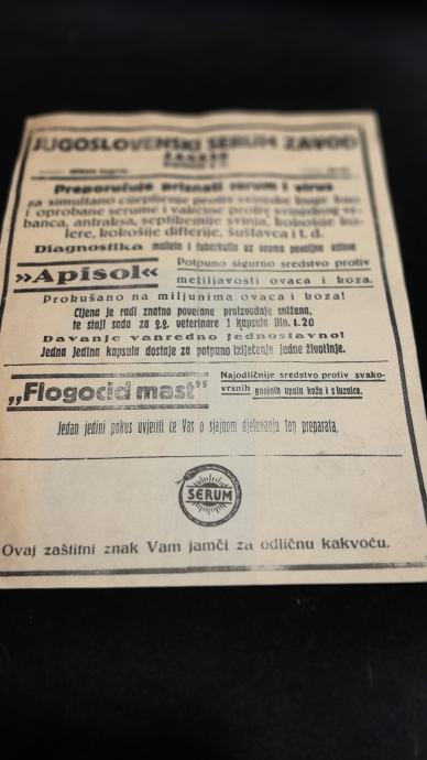 Serum zavod Predović boca i dvije reklame iz 1930-tih godina,prodajem isključivo sve u kompletu za fiksno 70 eura,ne šaljem poštom, može se pogledati na adresi