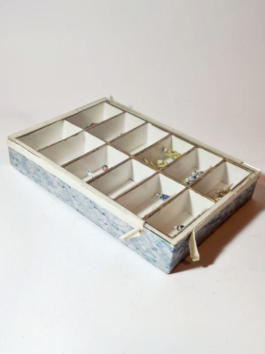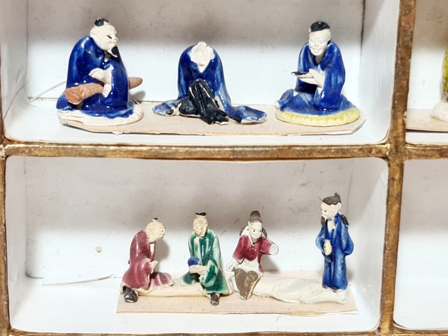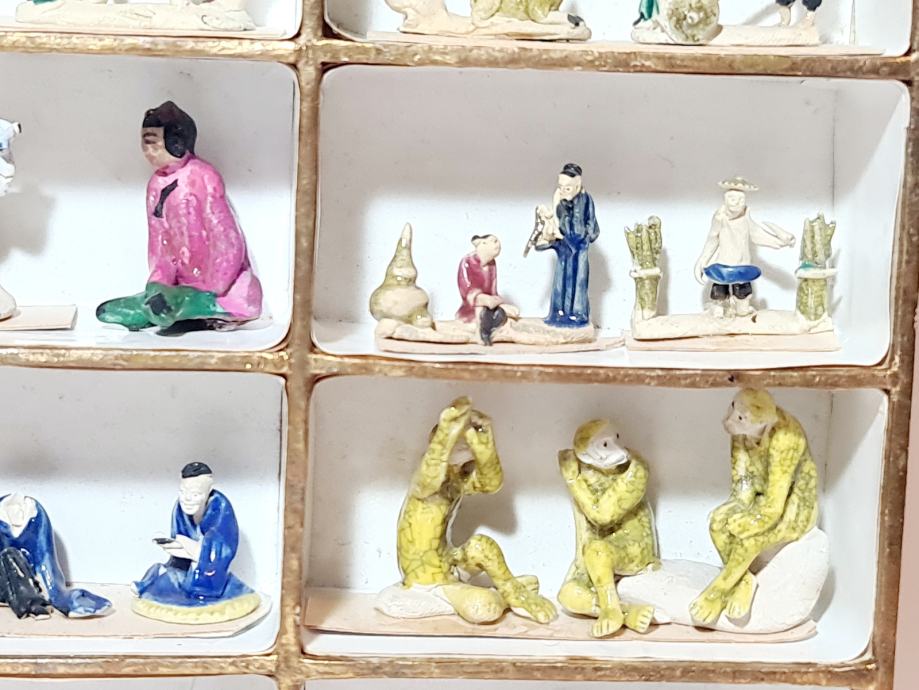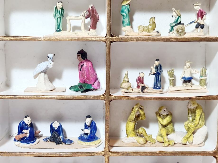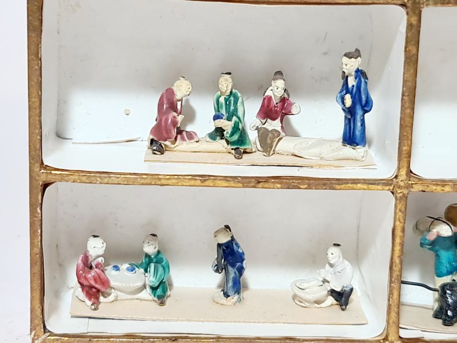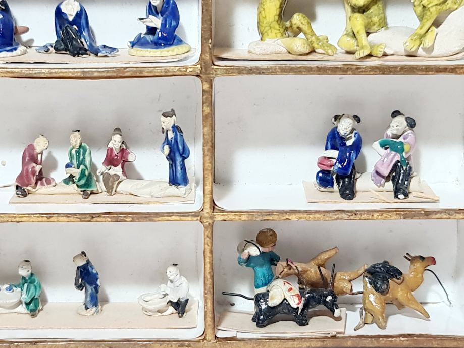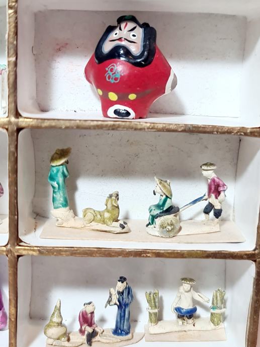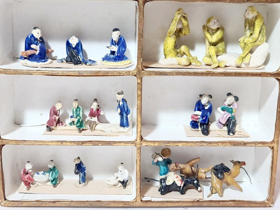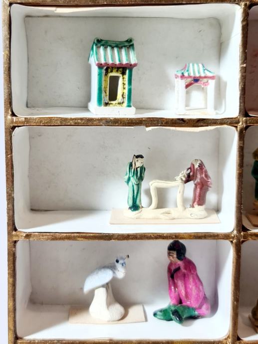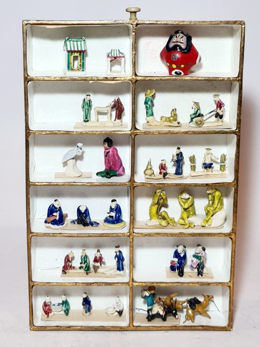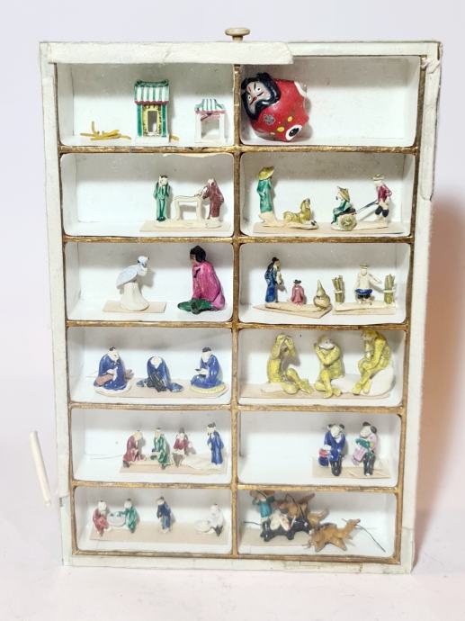 Ovaj set sadrži kolekciju ručno izrađenih minijaturnih figura smještenih u kutiji sa staklenim prednjim dijelom. Vjerojatno su izrađene od keramike, bogato detaljirane i prikazuju šarmantnu raznolikost scena. Set potječe iz prve polovice 20. stoljeća, vjerojatno iz Azije.