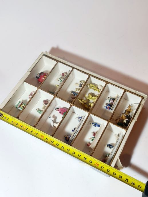 Stanje: Dobre općenito, s manjim nesavršenostima, kao što je prikazano na fotografijama. Jedna figura izgleda kao da ne pripada originalnom setu i napravljena je od različitog materijala. Također, jedna figura ima slomljenu glavu, što je vidljivo na fotografijama.