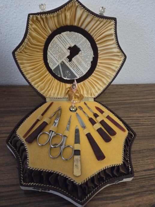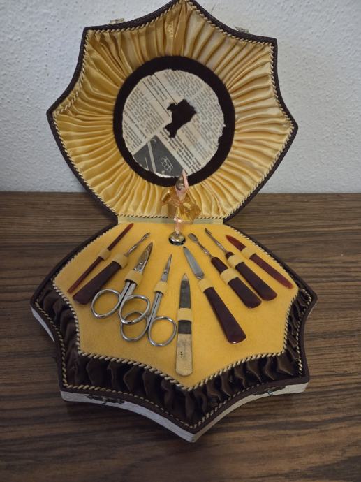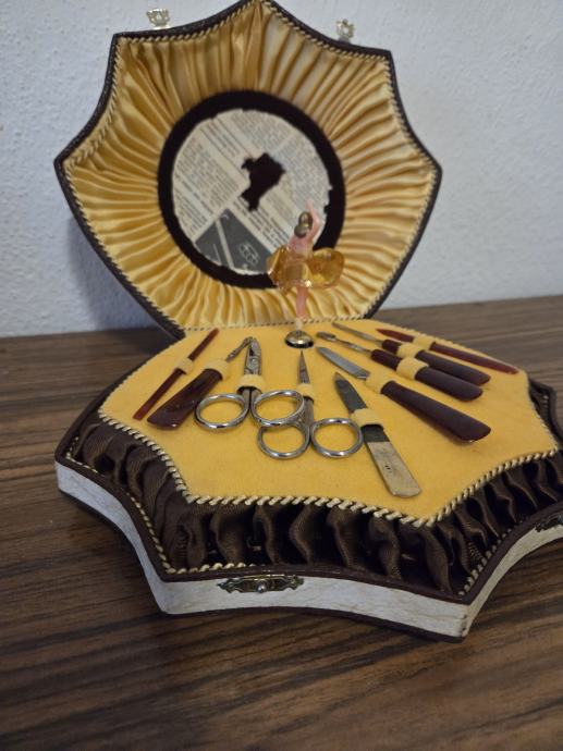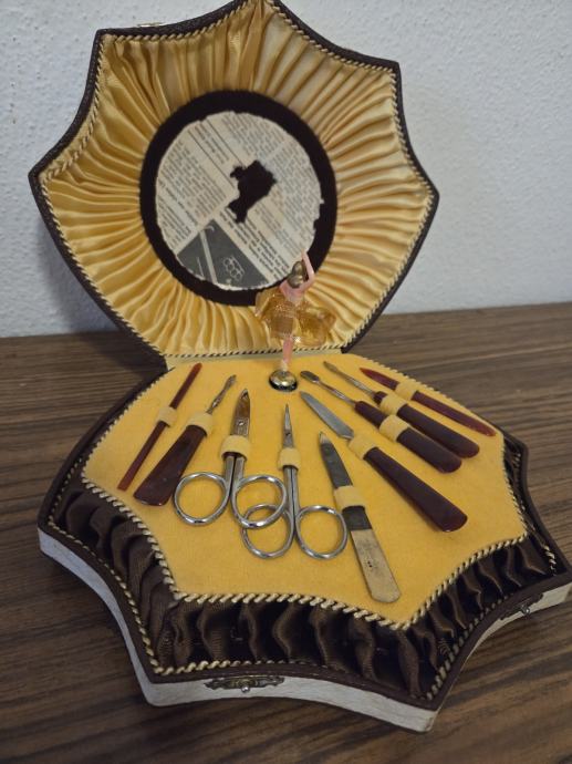 Vintage glazbena kutija sa šefom za mannikuru u original zdanju.