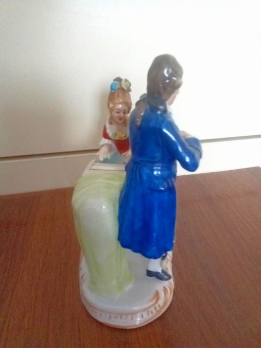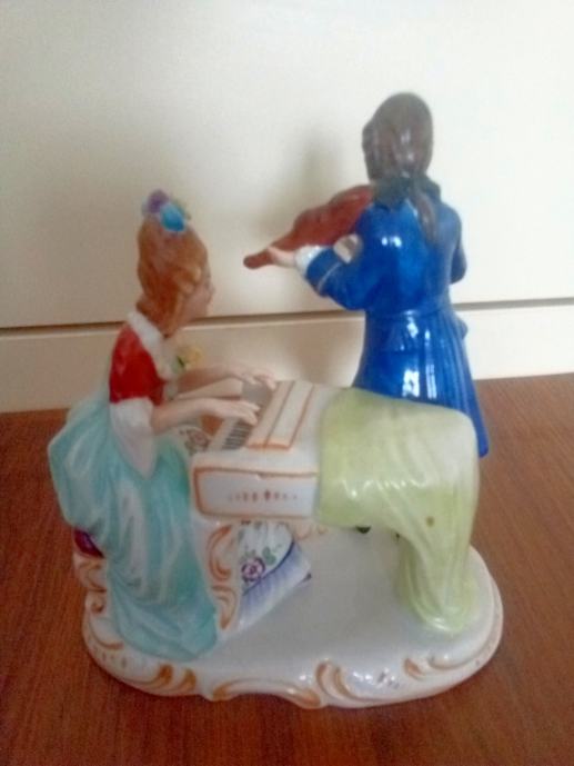 Porculanska figurica tirinške marke Sitzendorf, s motivom svirača. Proizvedena vjerojatno sredinom dvadesetog stoljeća. Oštećeno je jedino gudalo, koje je nekad vjerojatno bilo duže.