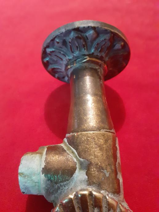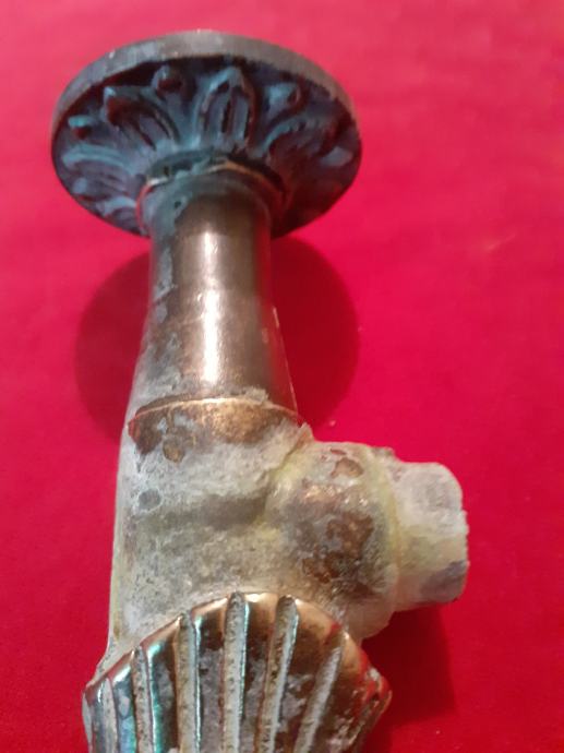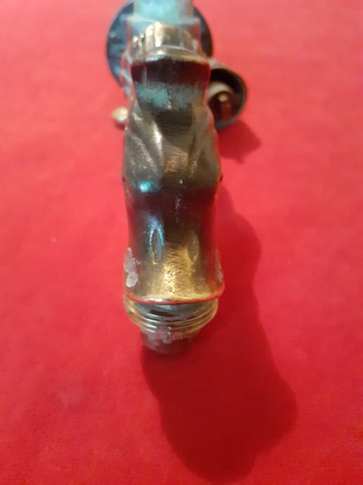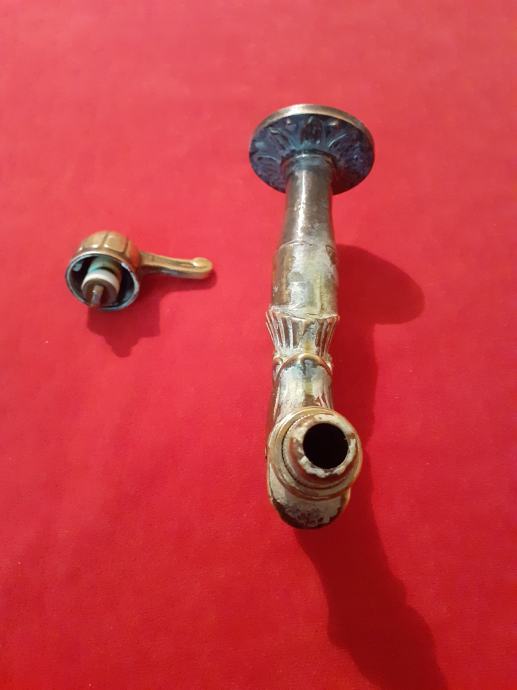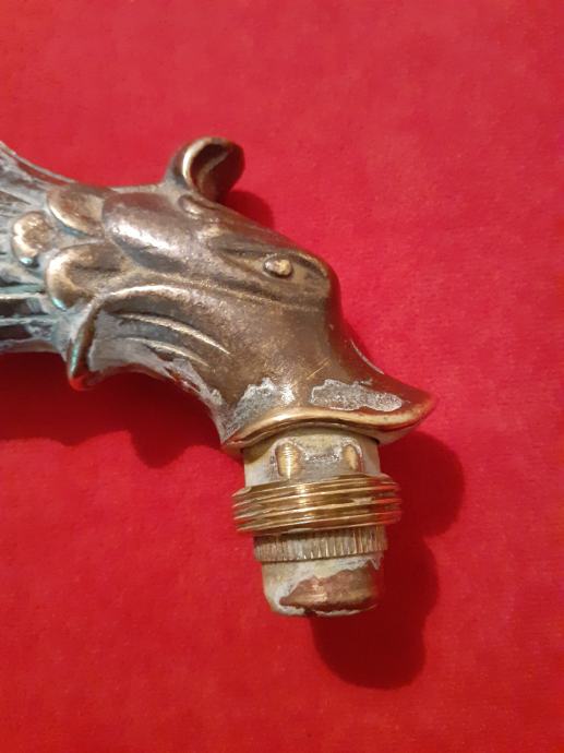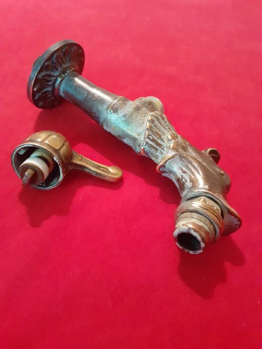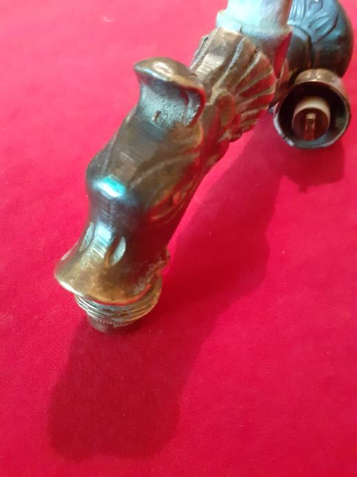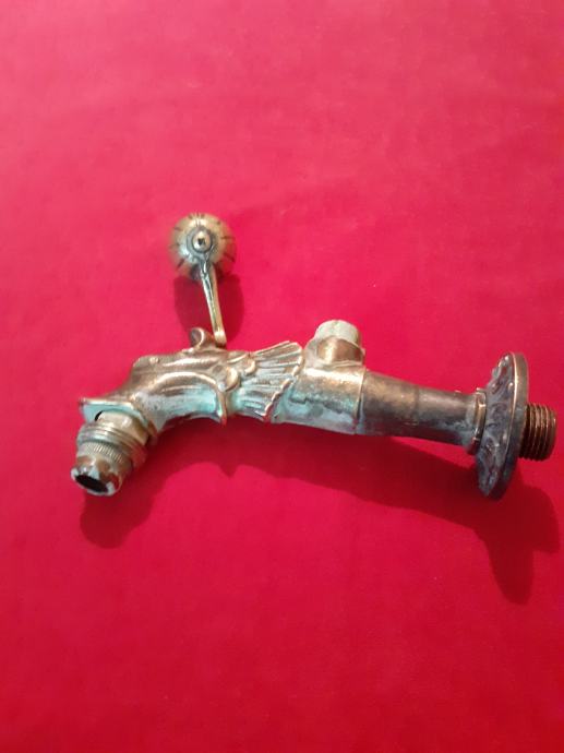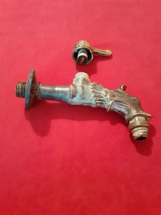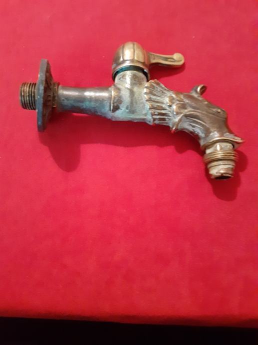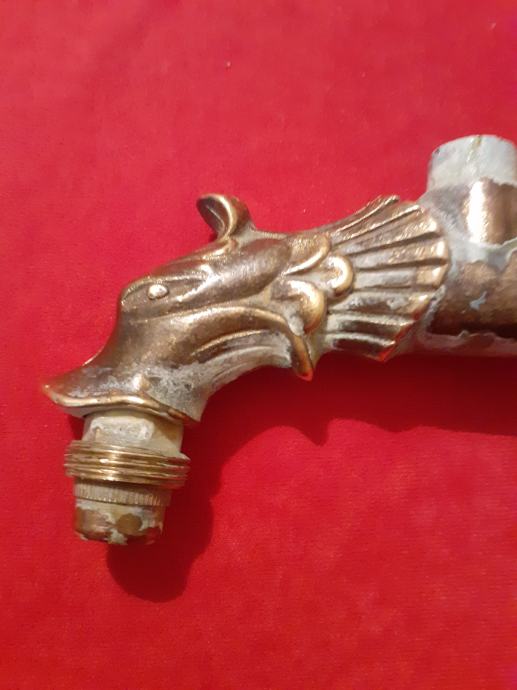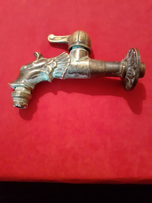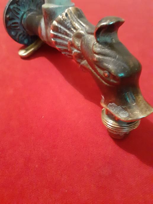 Prodaje se slavina od mesinga izrađena u obliku glave zmaja dužine cca 17 cm i unutarnjeg promjera cijevi cca 1,5 cm, sa vanjskim navojima cca 1,9 cm. Slavina je neispravna jer ventil za otvaranje/zatvaranje vode nije fiksiran za slavinu odnosno nije u funkciji. Cijena slavine je 133 eura. Mogućnost osobnog preuzimanja u Zadru. Kontakt broj mobitela 091 131 10 36.
