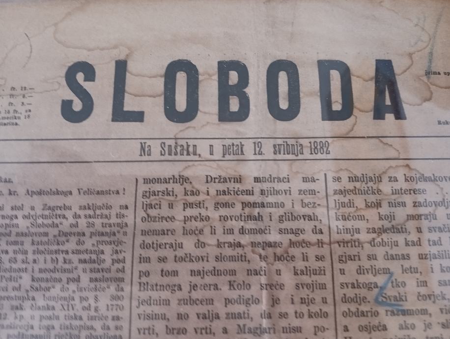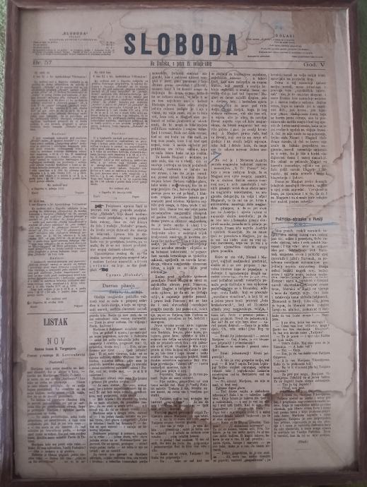 Prodajem dnevne novine Sloboda Sušak br 57 iz 1882g, izuzetno rijetko, uokvireno. Pogodno za dekoraciju konoba i sl. Dimenzije po visini 54cm i po širini 40cm. Plačanje na račun ili gotovina.