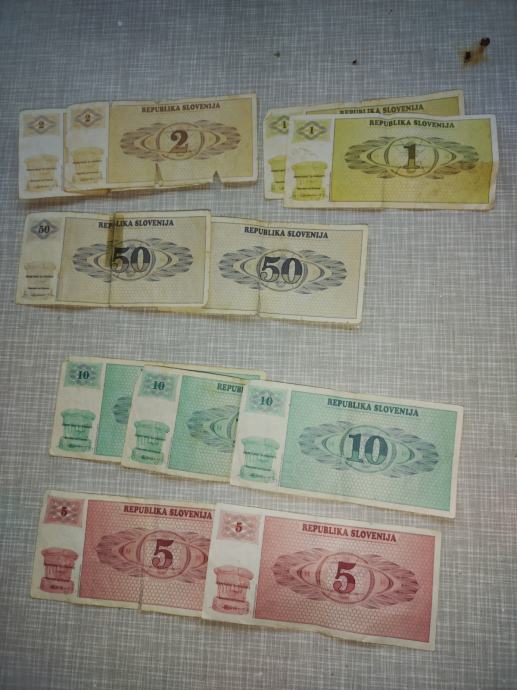 Prodajem Slovenski novac uveden 1991 tj. prije uvođenja Tolara. To su neki bonovi. Cijena je 3 €/kom (+ poštarina) ili 30 € za sve.