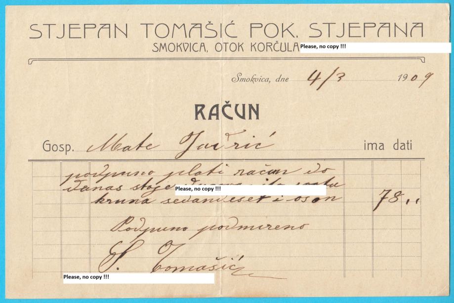SMOKVICA (Korčula) STJEPAN TOMAŠIĆ POK. STJEPANA dokument iz 1909.g.