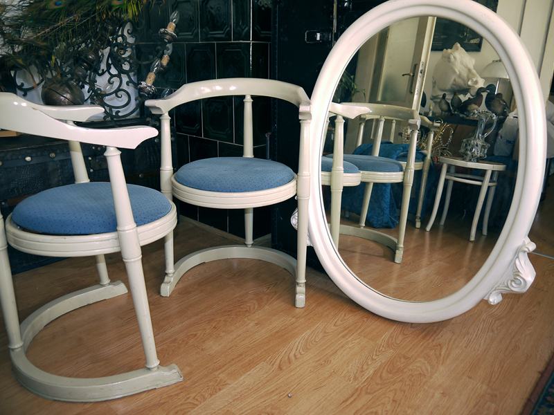 Tri stolice, veliko zidno ogledalo, mali thonet stolac, tri zastora, preparirani paun, vrč od murano stakla. Cijena na upit.