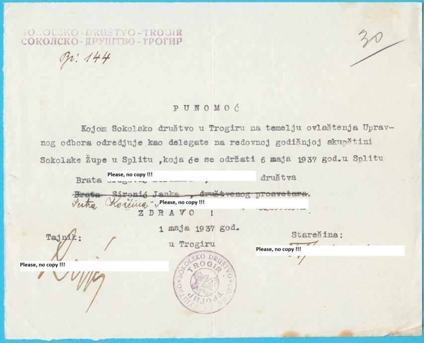 SOKOLSKO DRUŠTVO TROGIR originalni stari dokument iz 1937. g. * Sokol