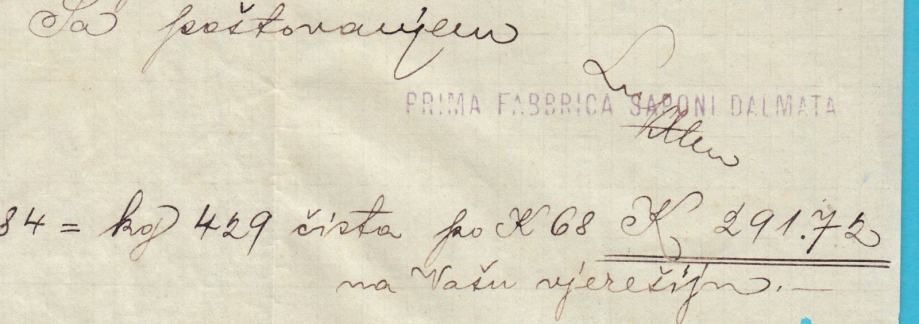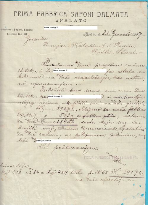 Stari originalni memorandum Prve Dalmatinske Tvornice Sapuna iz Splita (PRIMA FABBRICA SAPONI DALMATA - SPALATO) poslan davne 1907. godine i adresiran na gosp. Damjan Katalinić i Braća u Kaštel Stari.