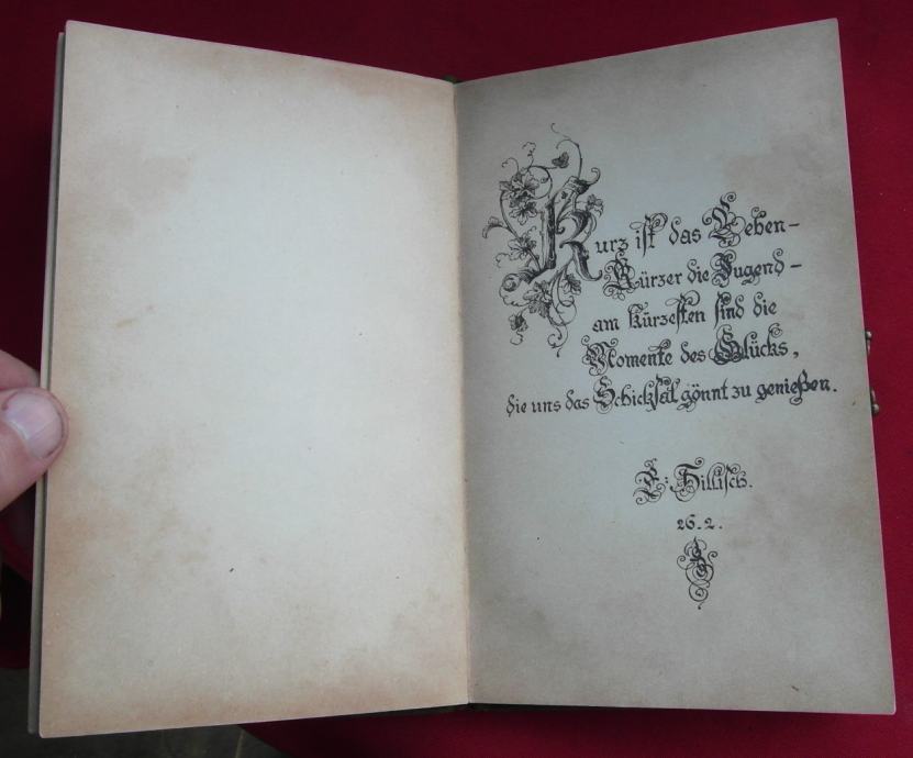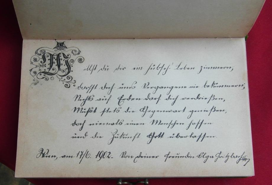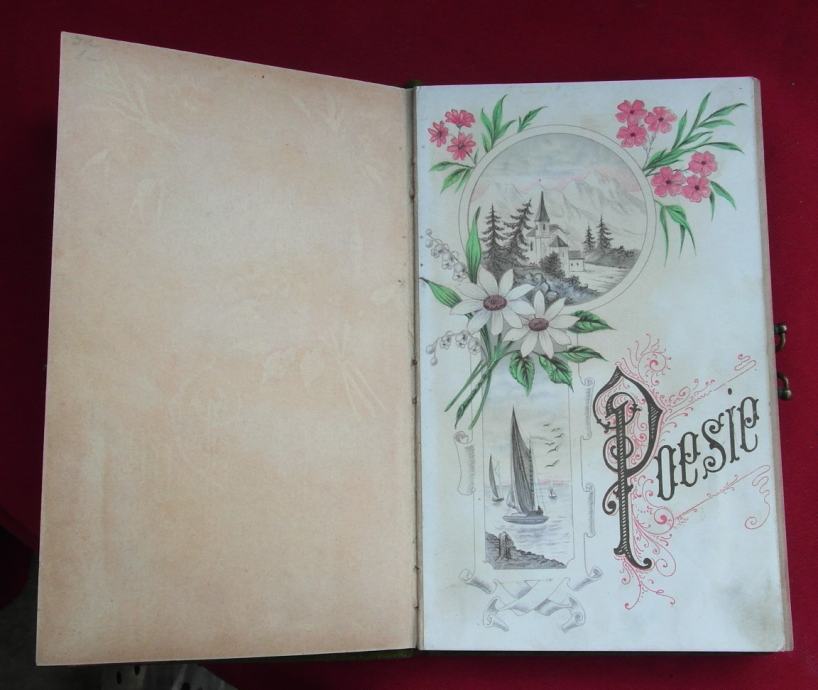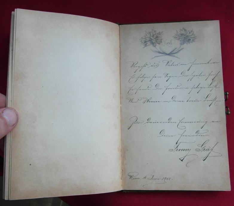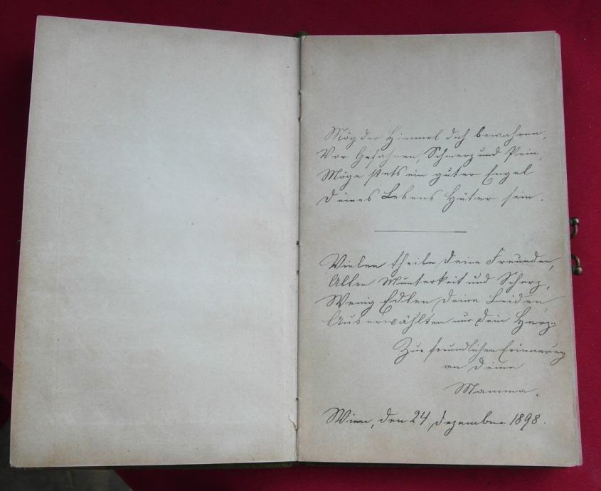 Na prednjoj strani mislim da je bio zalijepljen neki ukras, no isti se izgubio. Unutar spomenara je odlično stanje i ispisanih 31 stranica pisanih u Beču na njemačkom jeziku u vremenskom periodu od 1898 godine do 1902 godine.