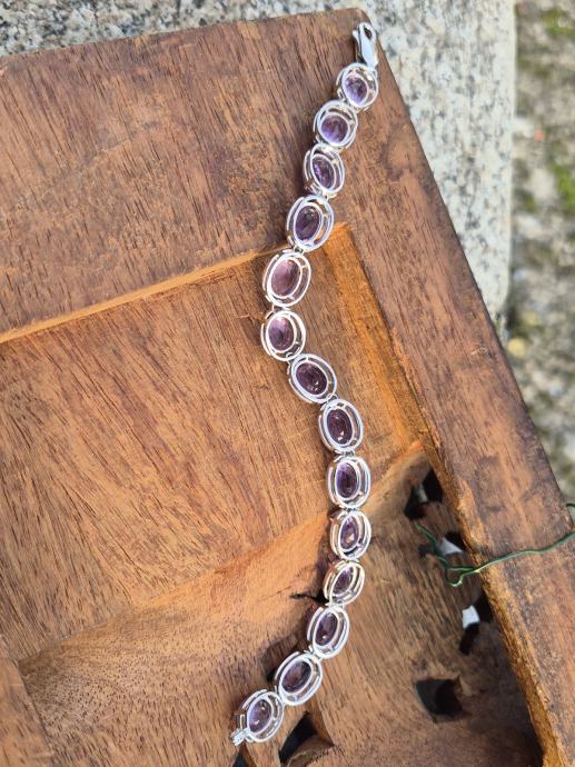 Srebrna narukvica s nizom ovalnih ametista posloženih u jednostavna srebrna ležišta.