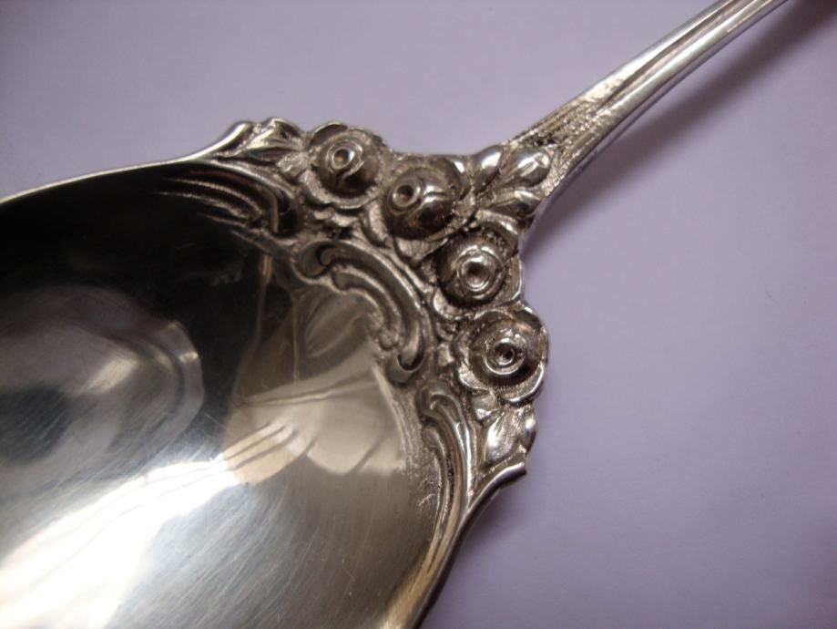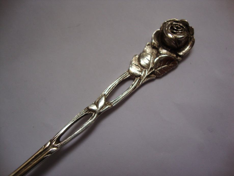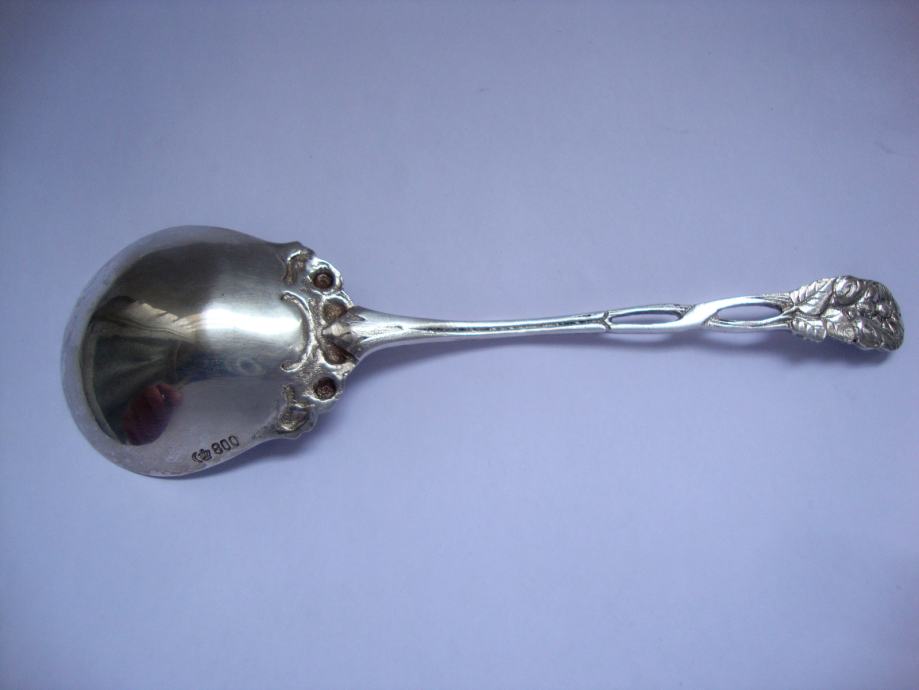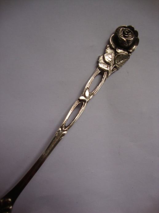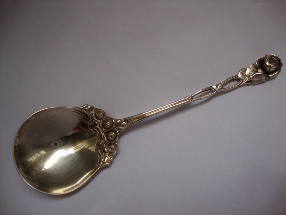 Krasna ukrasna servirna žlica za umake ukrašena ružom ručno kovano te izrađeno od srebra 800 žig njemačke mjesec kruna