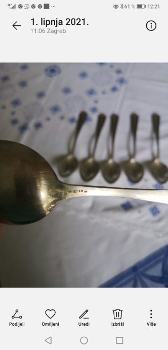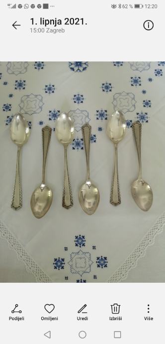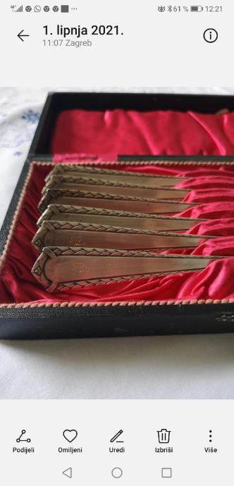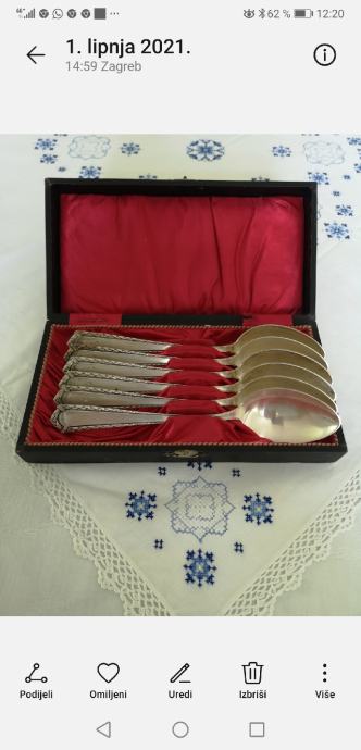 Komplet od 6 kom jusnih zlica od srebra finoce 800..sa pripadajucim zigovima.. u pripadajucoj original kutiji.. profinjen dizajn s kraja 19.st..duzina zlice - 21 cm... sirina zlice - 4,5 cm.. tezina zlica - 300 g.. Nazvati : 099 557 00 00..hvala..Pogledajte : SVI OGLASI OVOG OGLASIVACA pronaci cete i druge interesantne komade iz tog razdoblja i sl.