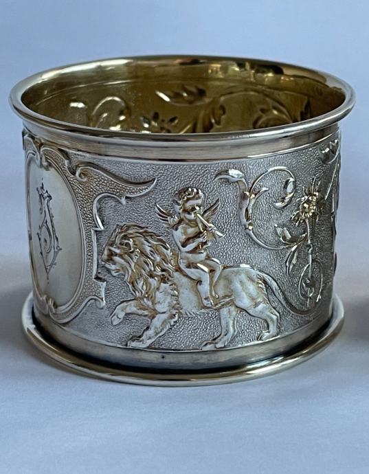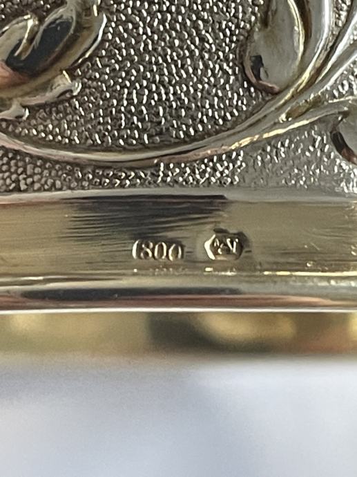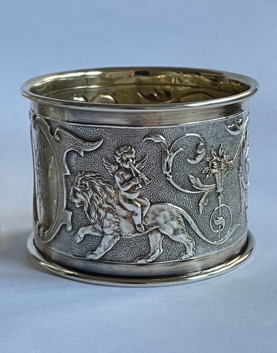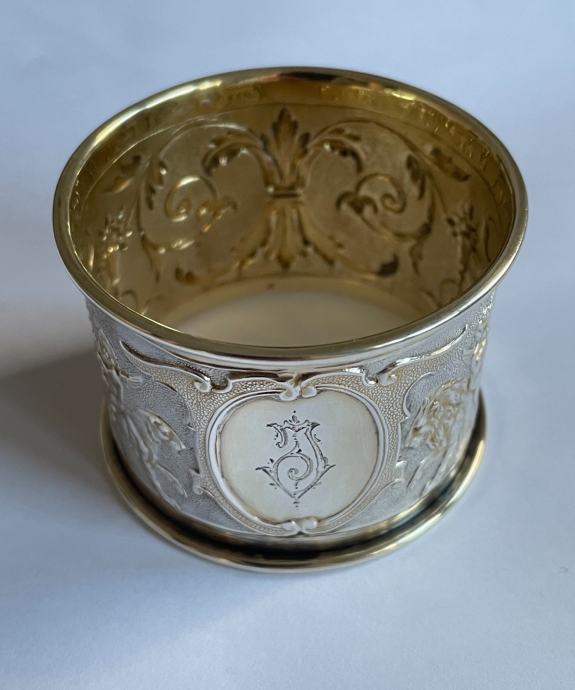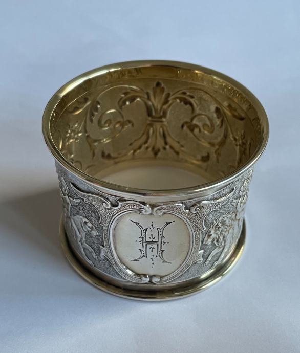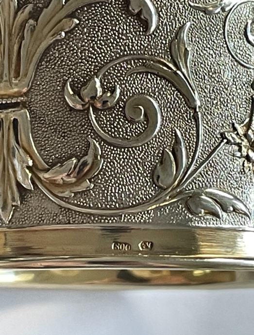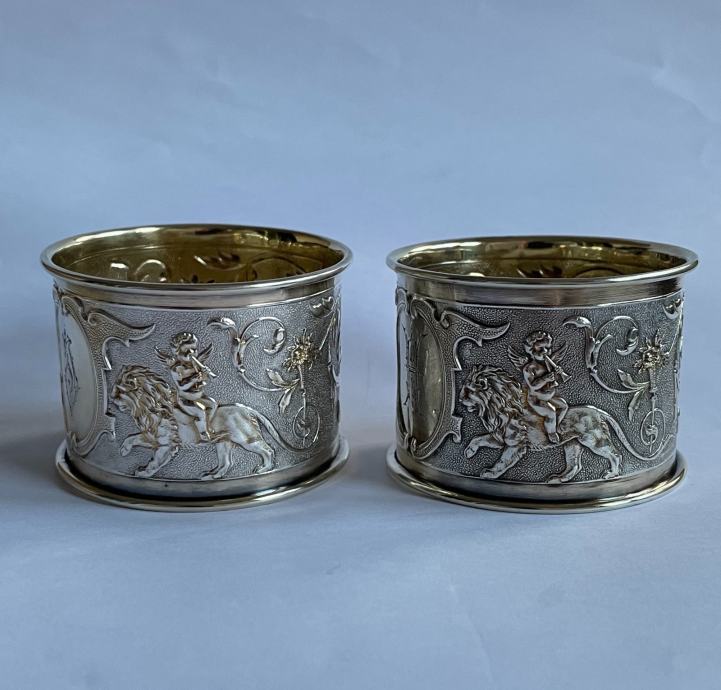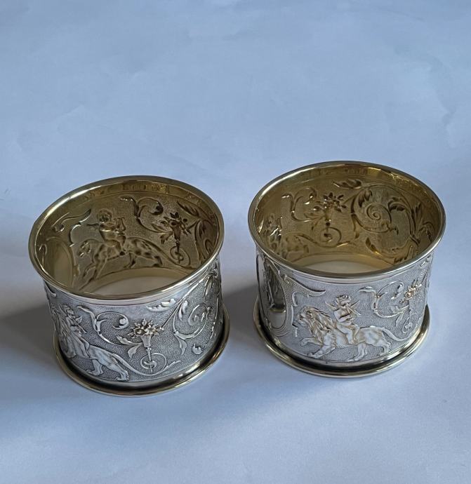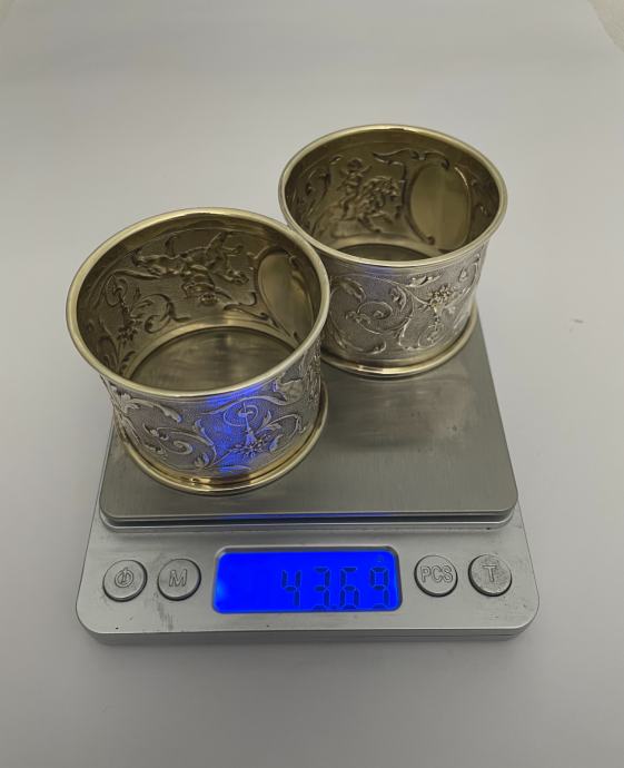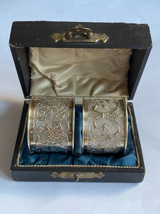 Prekrasan par srebrnih antiknih prstena - držača za salvete s početka 20. stoljeća u super stanju u originalnoj kutiji (urar i draguljar J. Dabrowski, Lwow). Utisnuta oznaka srebra 800, promjer 51 mm, visina 39 mm, ukupne težine 43,69 grama. Na prstenima je urezen monogram H i J.