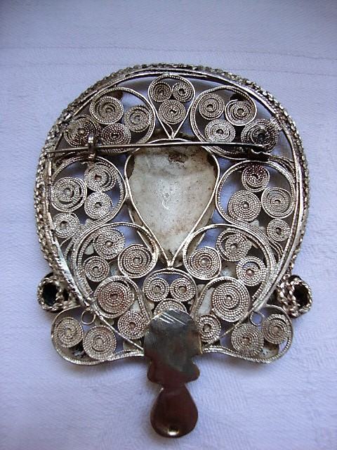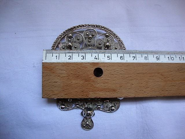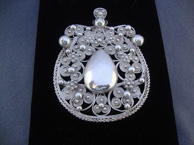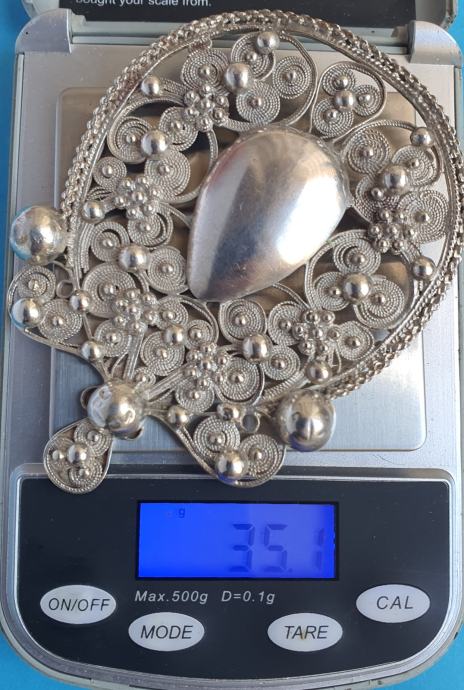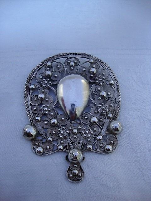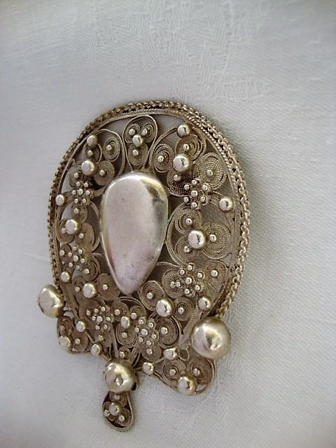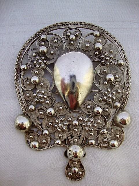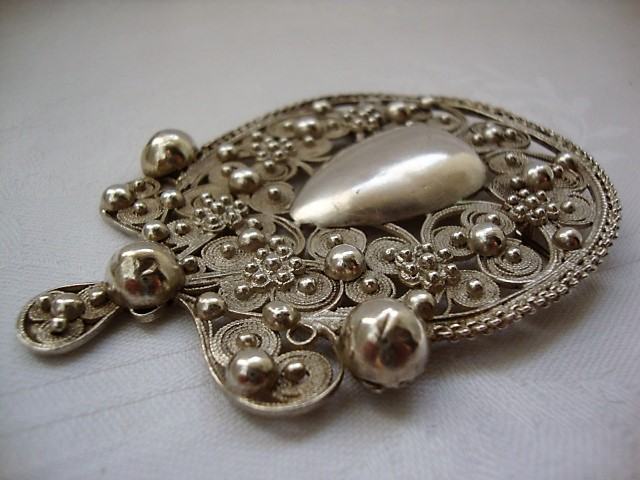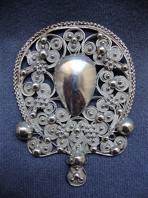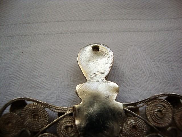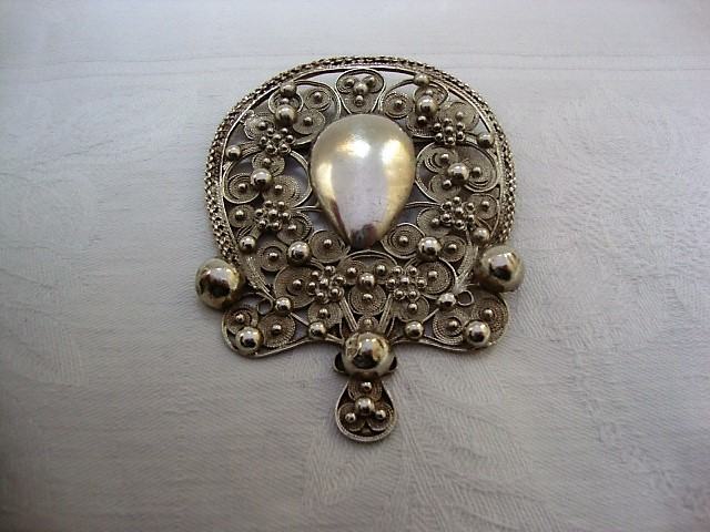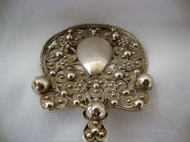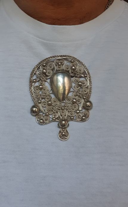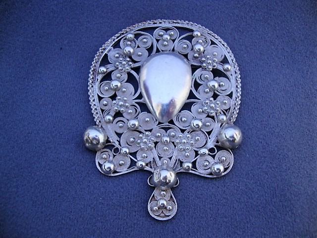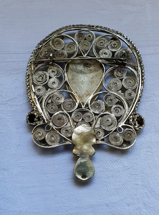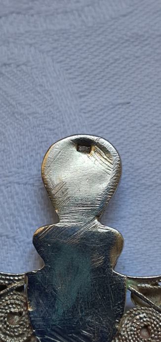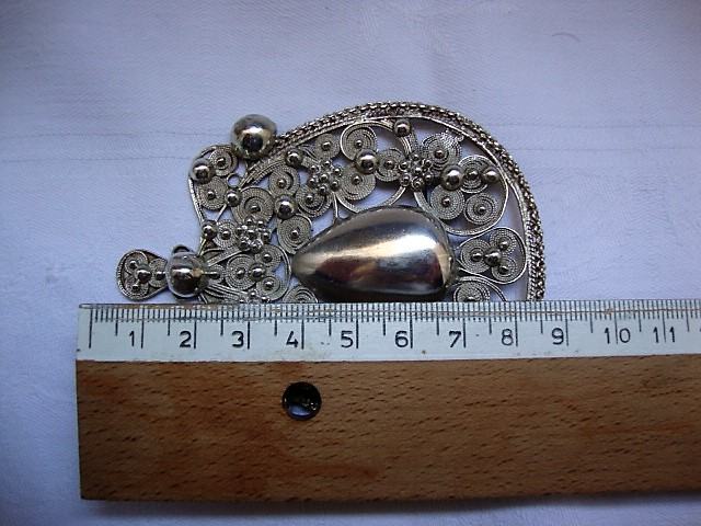 Veliki srebrni filigranski broš iz 19.stoljeća punciran oznakom srebra u vrhu iza na papućici