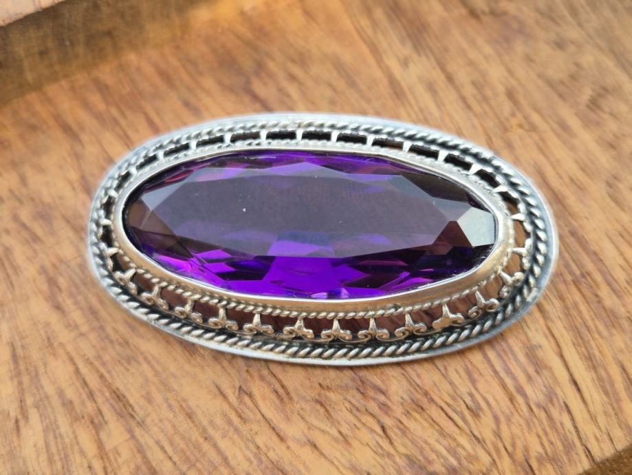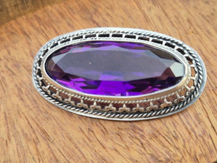 Srebrni broš s ovalno brušenim ljubičastim staklom, u fino izrađenom okviru.