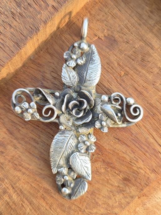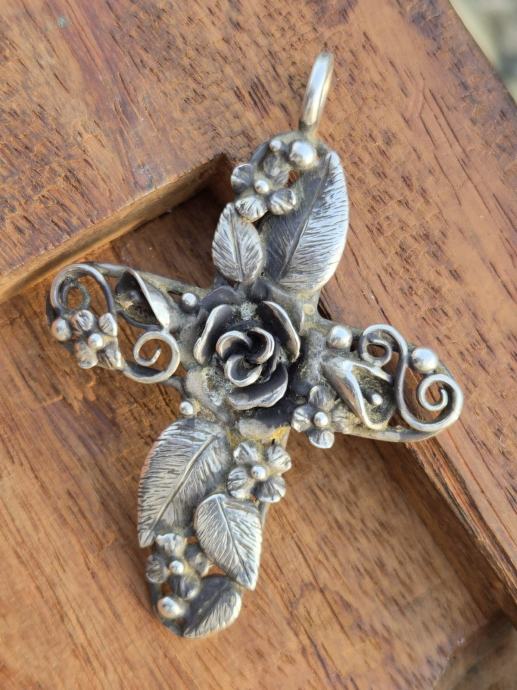Srebrni privjesak u obliku križa, reljefno izrađen s floralnim motivima.