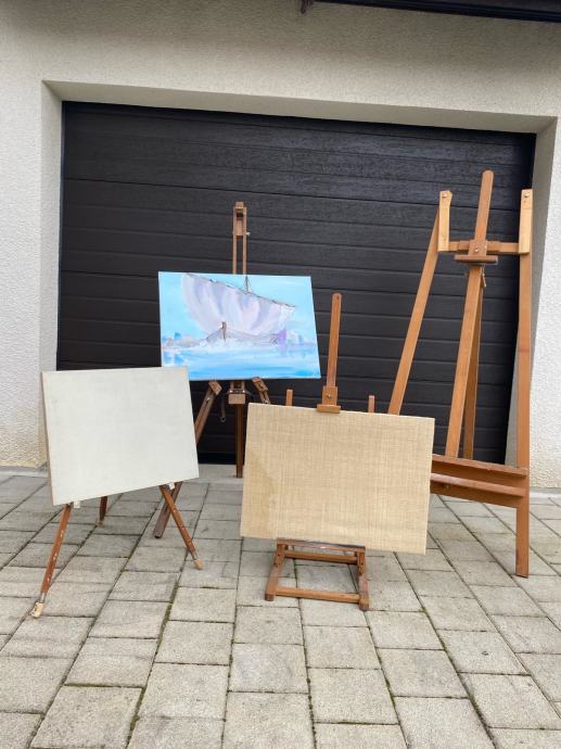 Stalak trokutaste/tripod konstrukcije, visine otprilike 35–45 cm. Idealan za izlaganje manjih slika, fotografija i platna. Lako prenosiv i zauzima malo prostora prilikom skladištenja. Stanje vrlo dobro.