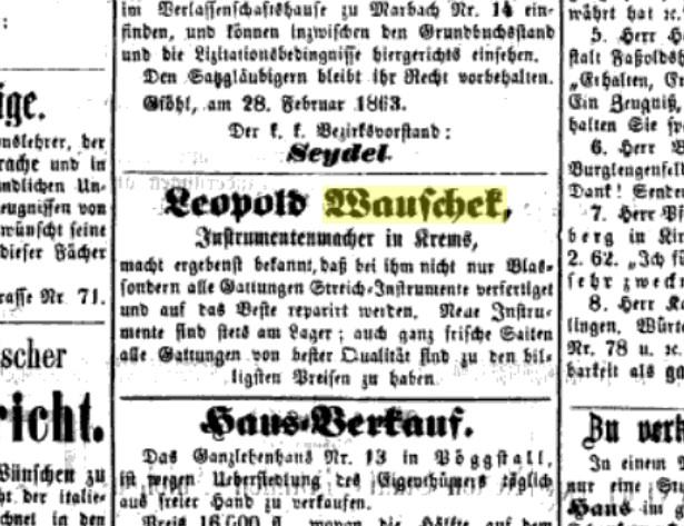 (postoji info da je Leopold Wauschek, (slika u prilogu) oglašavao svoju radionicu u lokalnom listu grada Kremsa god. 1860-te. Link:https://books.google.hr/books?id=u9kE11RkX9IC&pg=PP80&lpg=PP80&dq=Karl+Wauschek+Krems+Untere+Landstrasse+Nr.+6&source=bl&ots=rRNFNa0kex&sig=ACfU3U2y2xa61gssNZFZj6rnpEsSBRy1Fg&hl=hr&sa=X&ved=2ahUKEwiIiarYlMaGAxUC_gIHHTdEKXsQ6AF6BAgIEAM#v=onepage&q=Wauschek&f=false