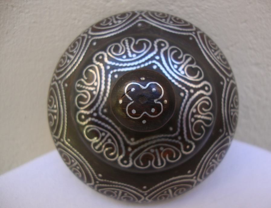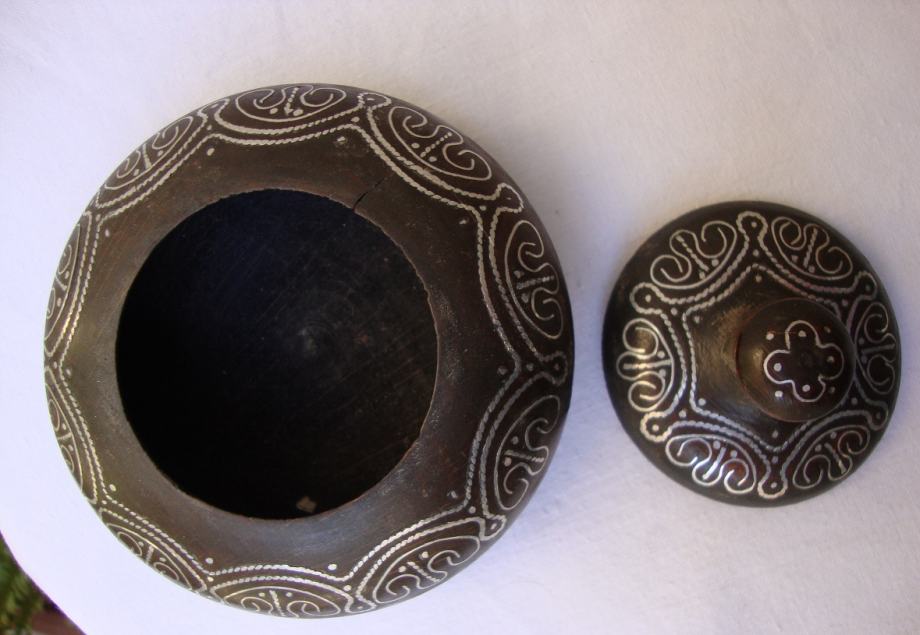 Crno drvo ebanovina sa pravim SREBRNIM INTARZIJAMA komadima srebra utisnutih ručno utuckavanjem u drvo stara tehnika sa kraja 19.stoljeća (nije oslikano tako da je uvijek ovako ljepo )