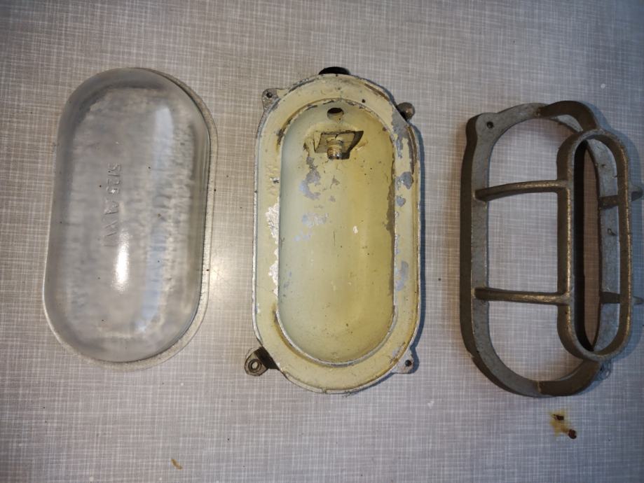 Prodajem staru industrijsku stropnu lampu, stanje prema slici. Dajem i još jedan zaštitni "kavez" za gornju stranu jer ga imam viška.