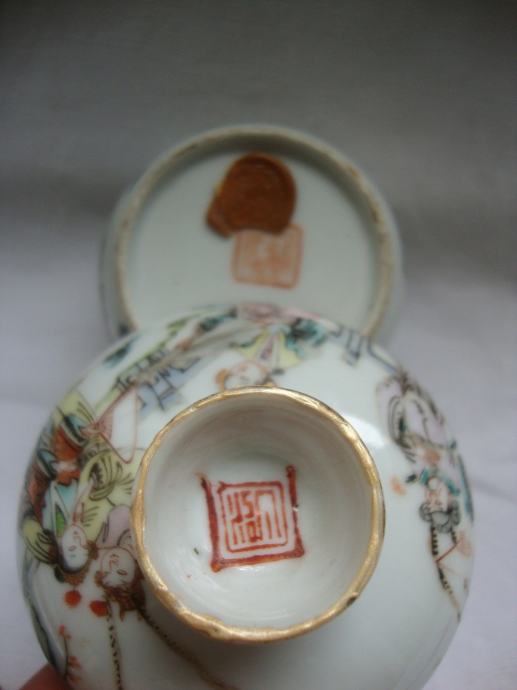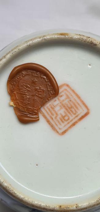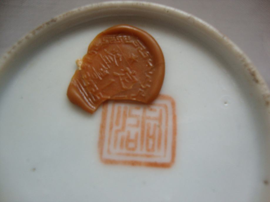 Na dnu donje posude isto tako u dnu crveni žig + još jedan voštani iznutra slikovni u obliku slova A