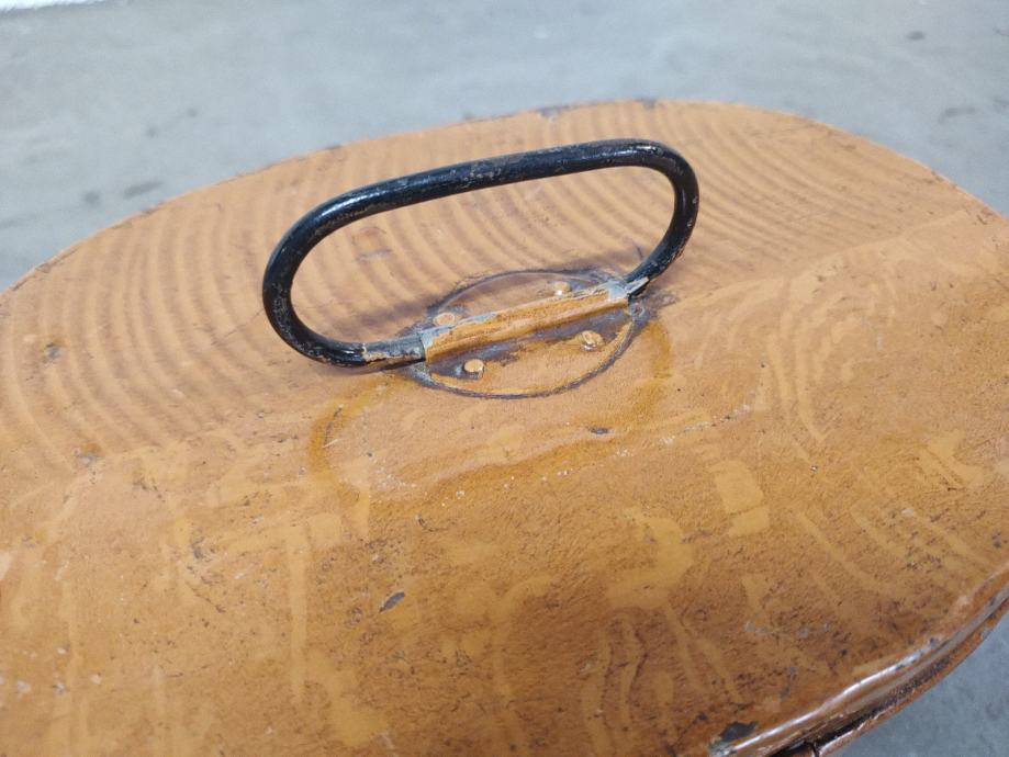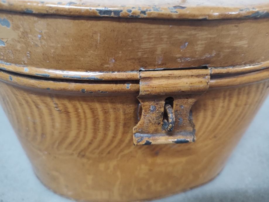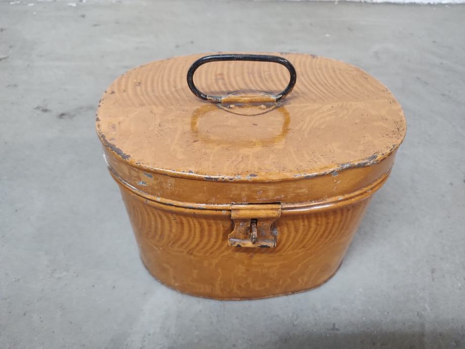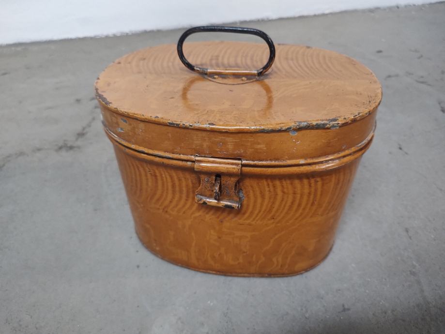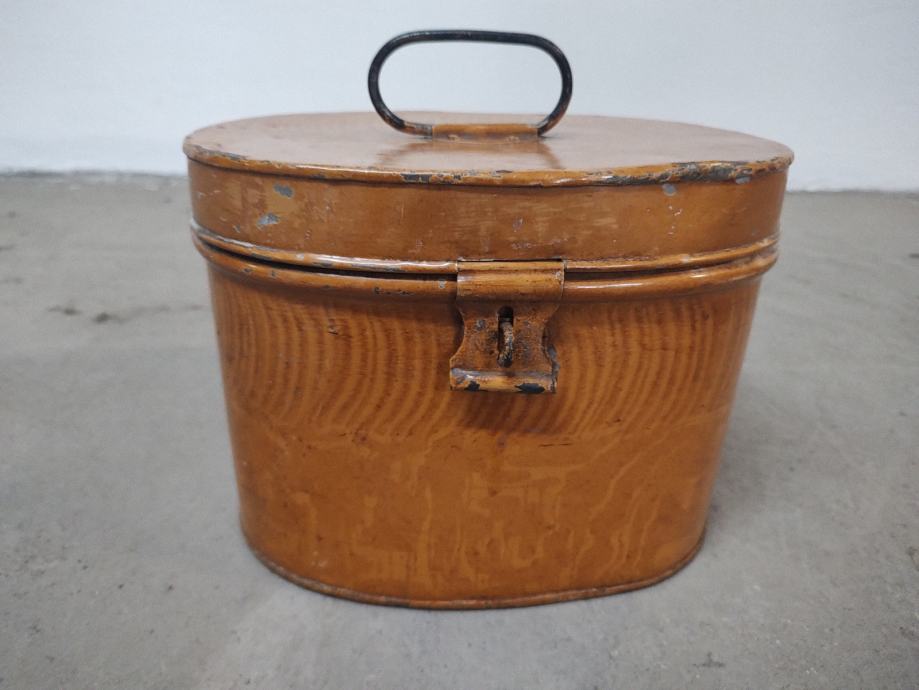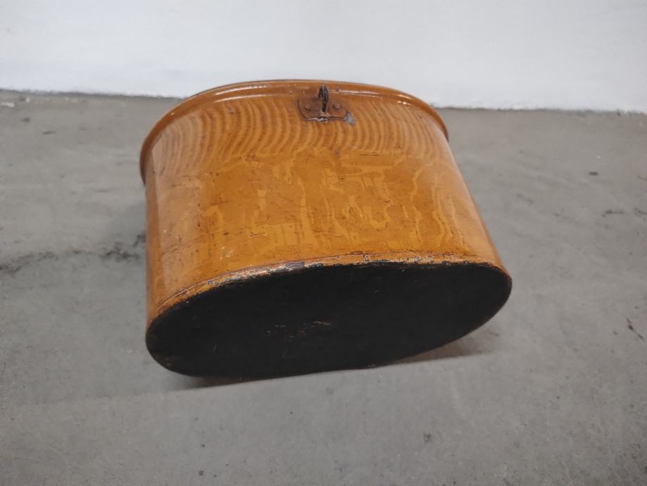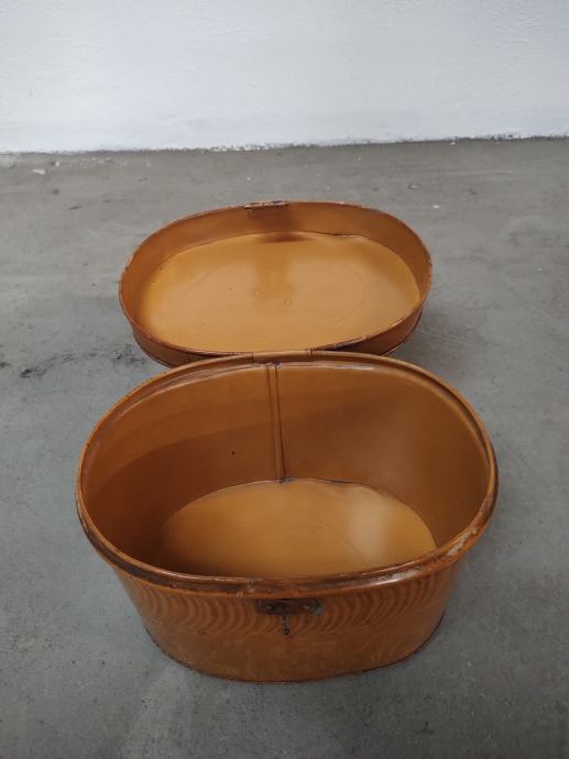 Metalna kutija za šešire iz kasnog 19. stoljeća u viktorijanskom stilu ovalnog oblika. Za manje šešire. Izrađena od metala sa izgledom drveta. Kutija potječe iz viktorijanskog doba, te ima metalni prsten za ručku na vrhu i zaključavajući zasun na prednjoj strani.