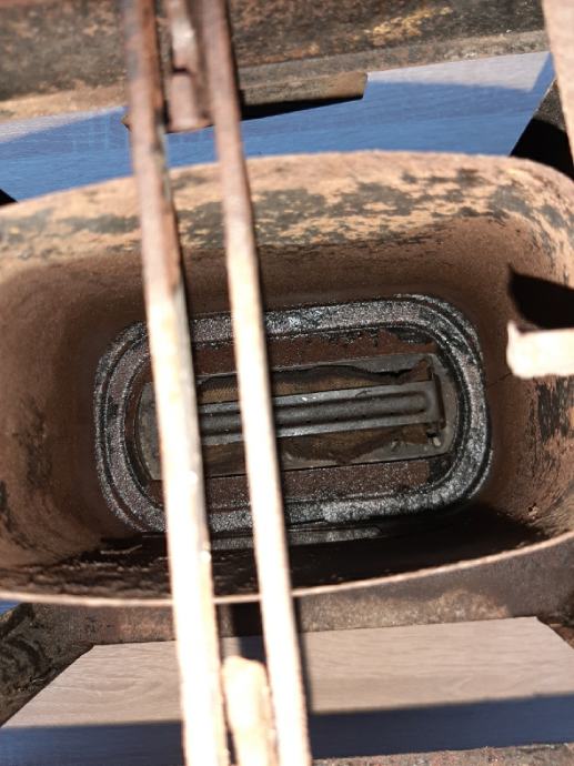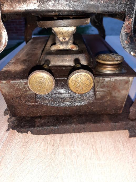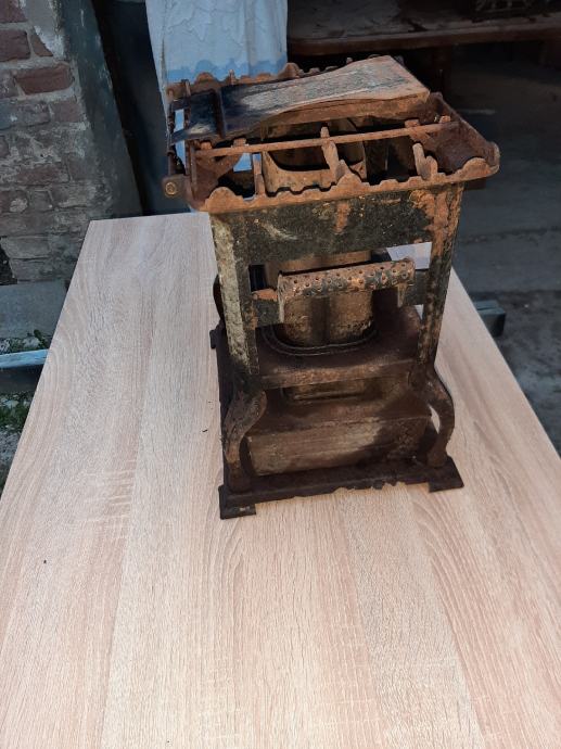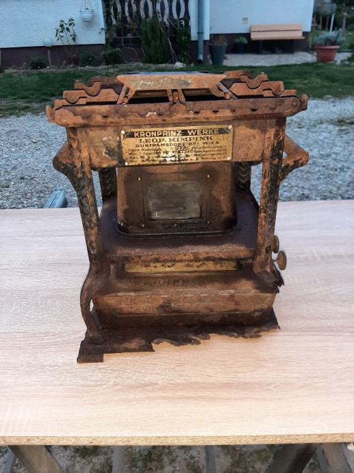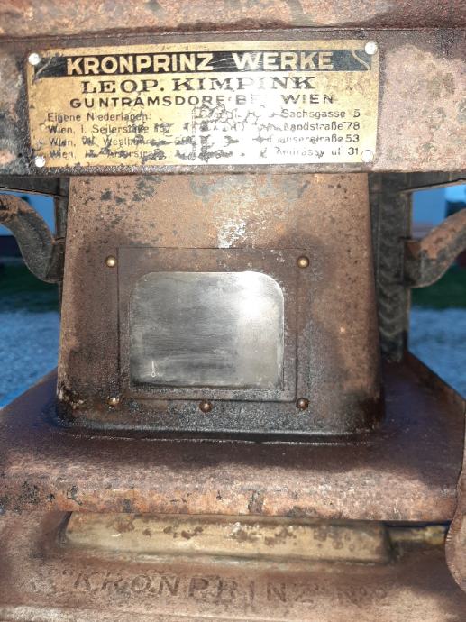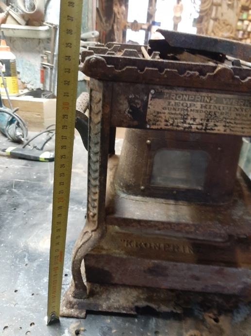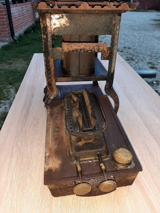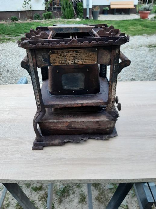 Prapovijesna lampa na petrolej ili gas.ima u sebi siroku tinjalicu koja se pali .kotacici za pojacavanje svjetlosti rade kao i poklopac rezervara .materijal same lampe metal dok su kozacici nekakve zlane boje sa gravurama.ima ostecenje.dimenzije visine cca 40 cm sirine 25.ljepi ukras za konobu ili peku.
