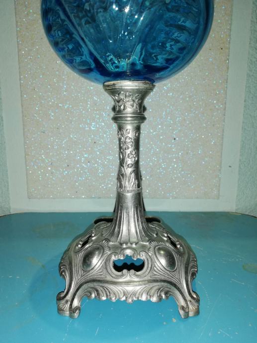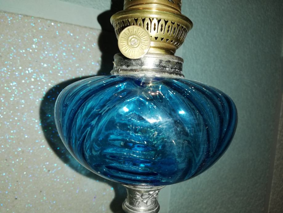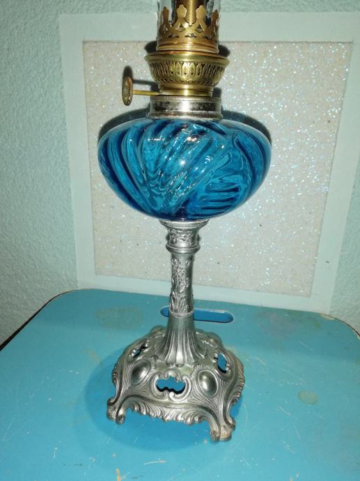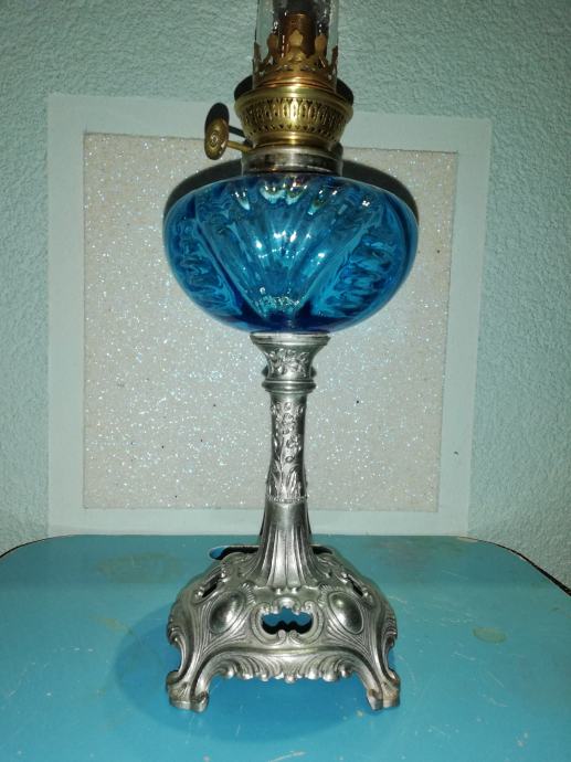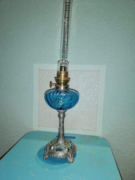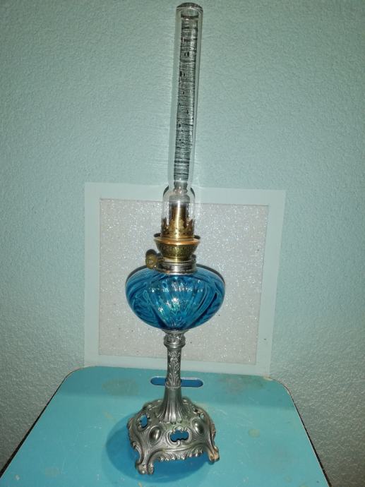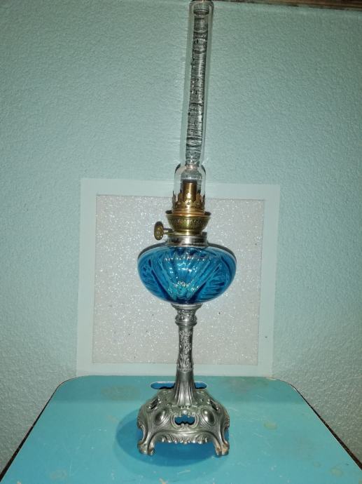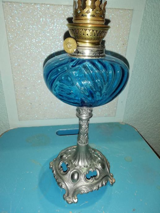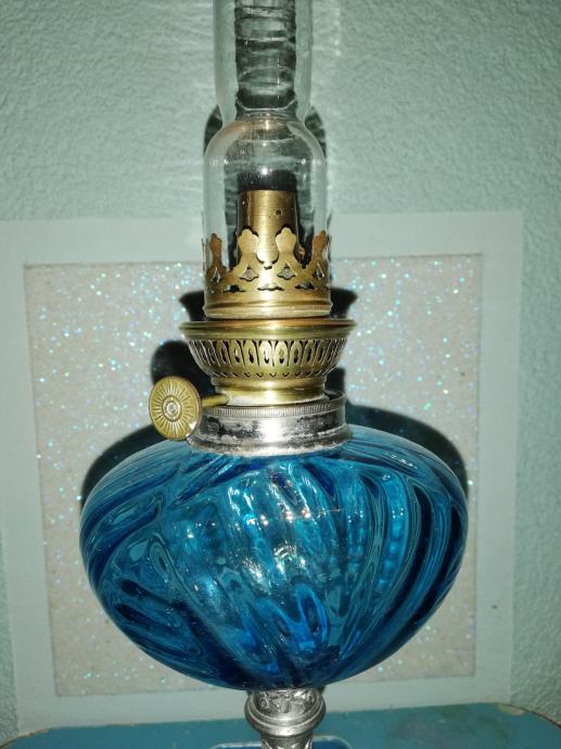 Stara petrolejska lampa, prijelaz 19/20 st., materijal:plavo kristalno staklo, legura bakra, mesing, staklo.Podrijetlo :Francuska. U odličnom stanju.