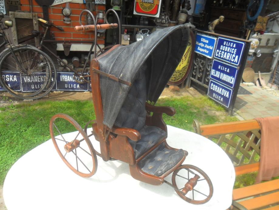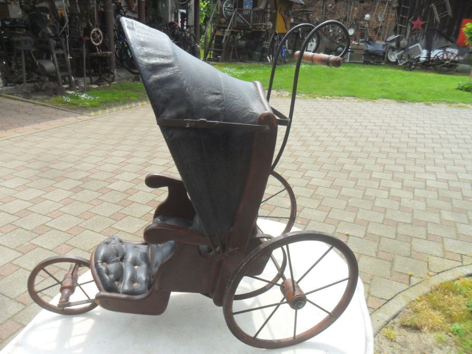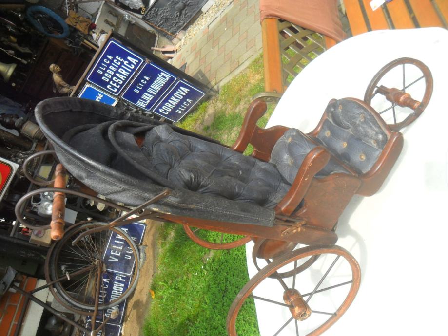 prekrasna kolica,ručno rađena u kombinaciji drva ,metala,i kože..dimenzije su 58 x 35 x 60cm(v x š x dužina) sklopiva kožna kupola.oštečenja nekih posebno nema,jako stari rad i dekorirat če svaki prostor...pogledajte moje ostale oglase starina i antikviteta